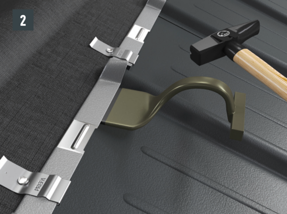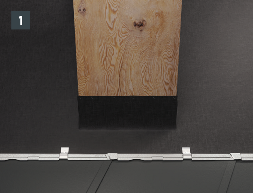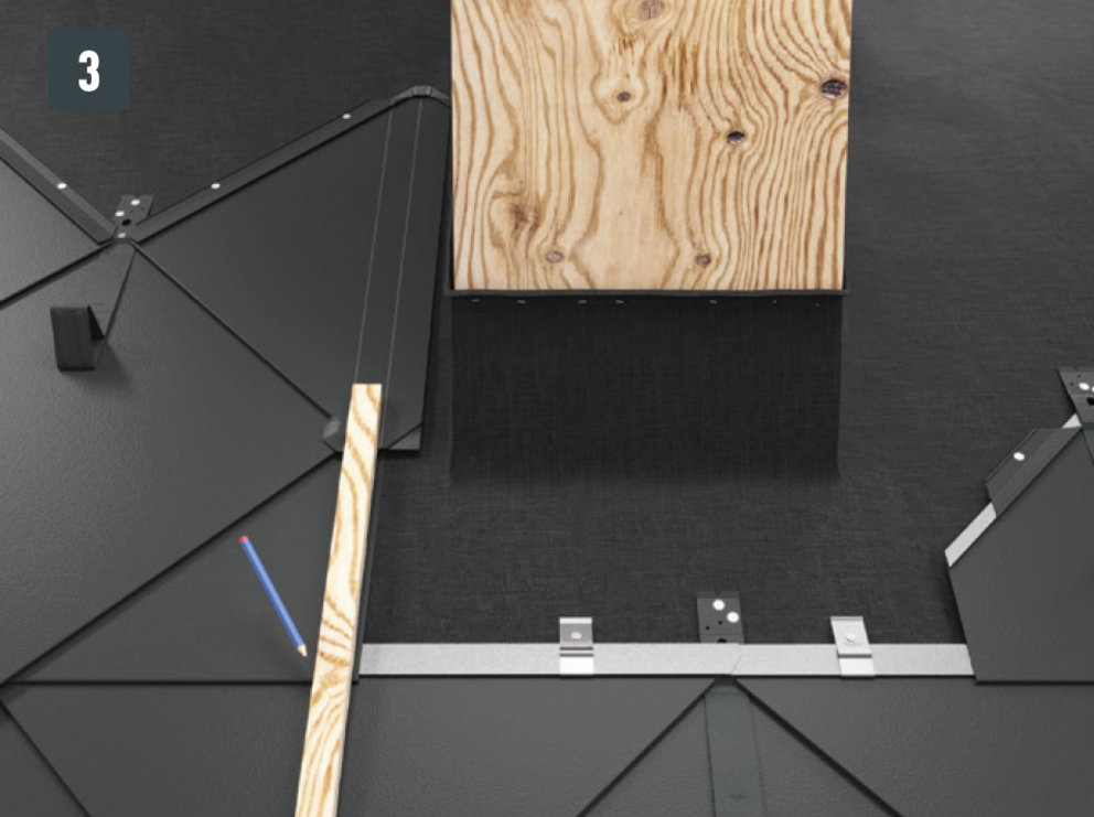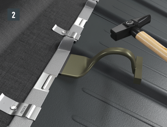 Ter voorbereiding op het voorste deel van de omlijsting dienen voor daklosanges van 29 × 29 of 44 × 44 eindpannen te worden gelegd. Deze maken een horizontale inhaakvouw mogelijk zodat de omlijsting een regenbestendige aansluiting krijgt. Bevestig elke eindpan voor daklosanges van 29 × 29 met behulp van 1 gepatenteerd anker en voor daklosanges van 44 × 44 met behulp van 2 gepatenteerde klangen.