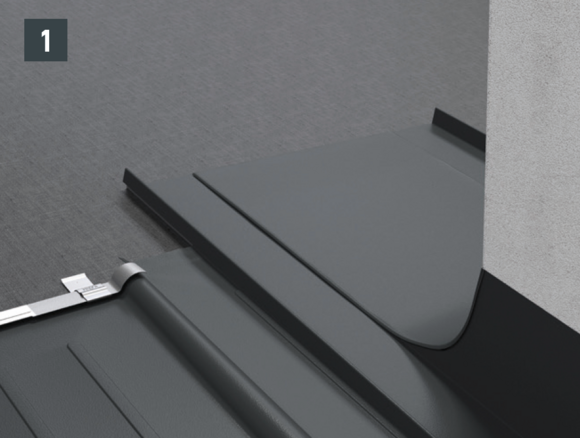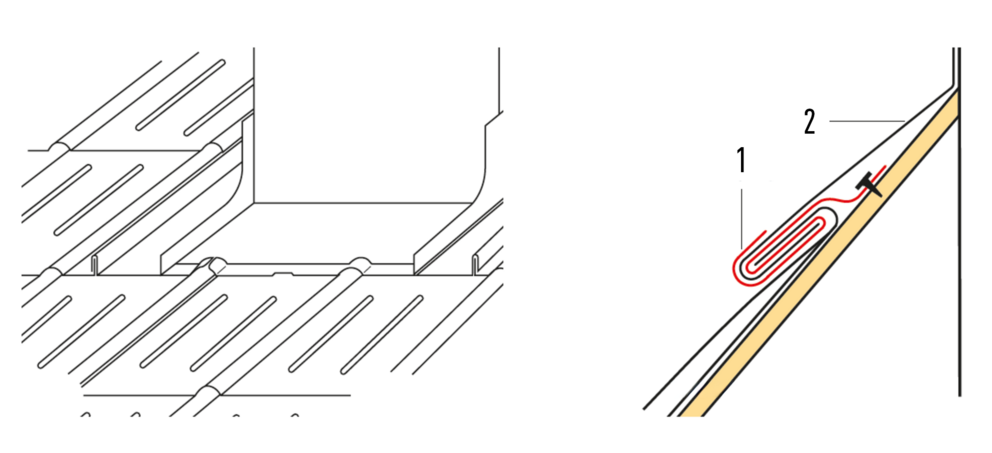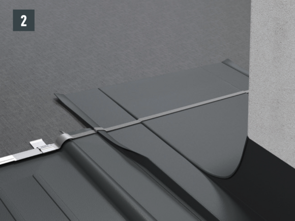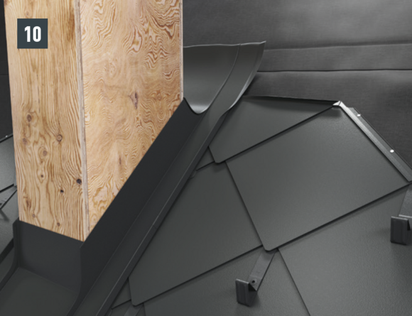 Bij elke opstaande rand aan de linkerzijde van de dakschindel en de dakschindel DS.19 moeten de schuin naar beneden verlopende vouwen worden ingekeept om een capillaire werking te vermijden.