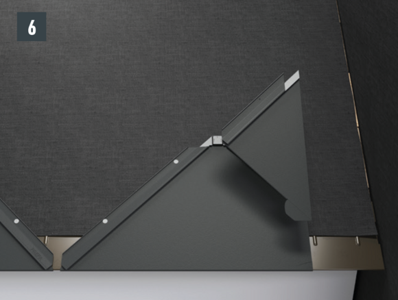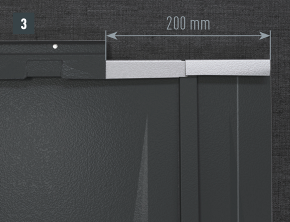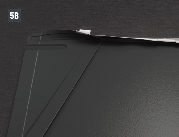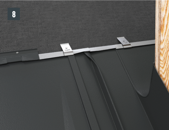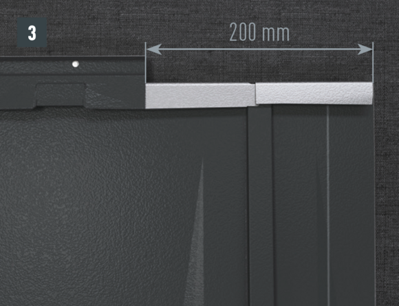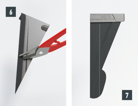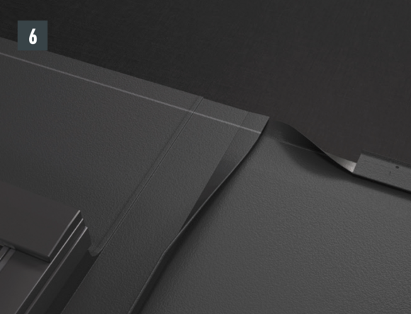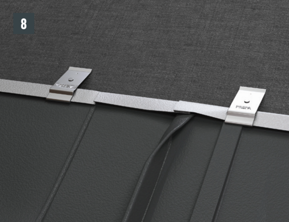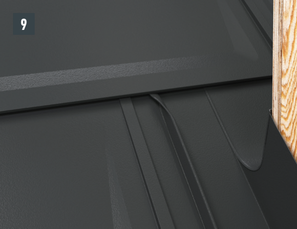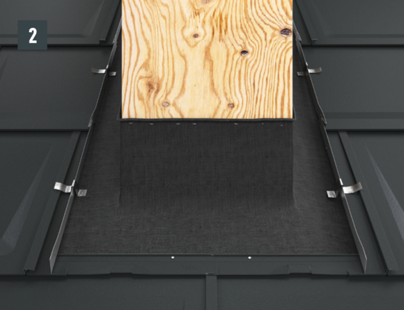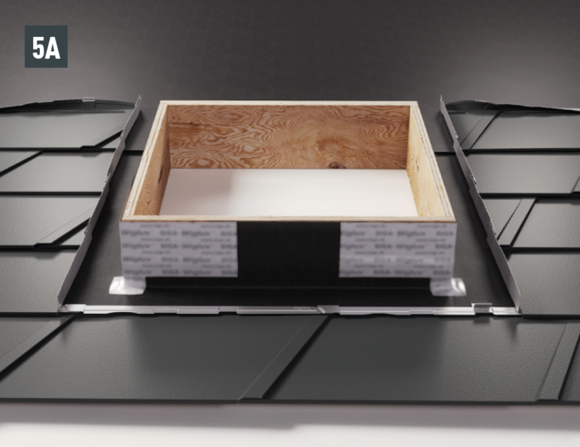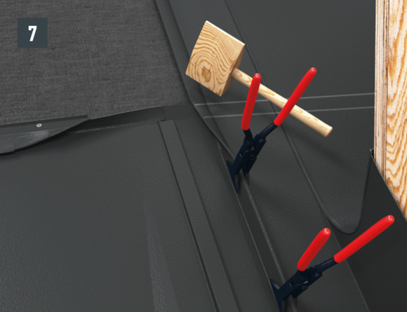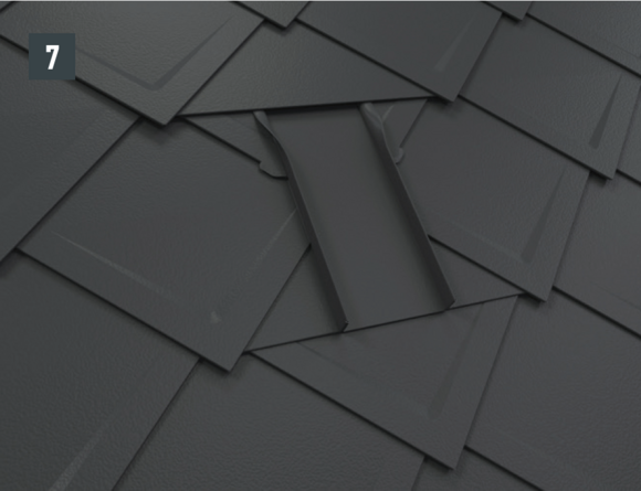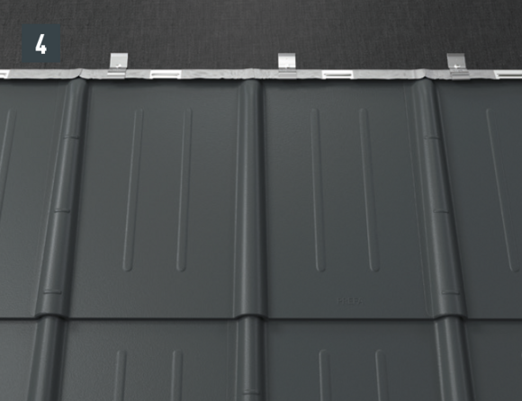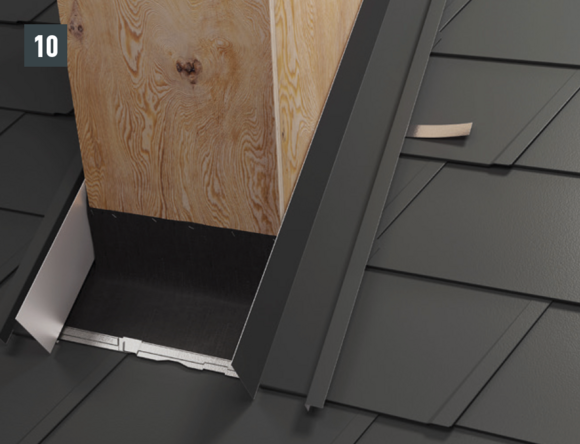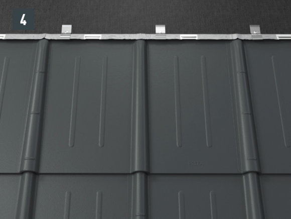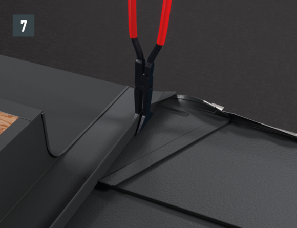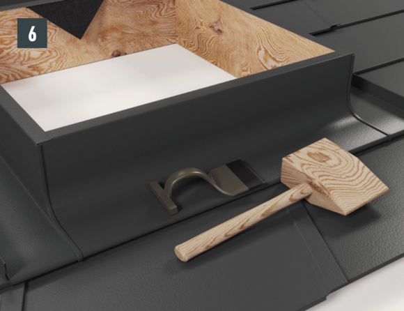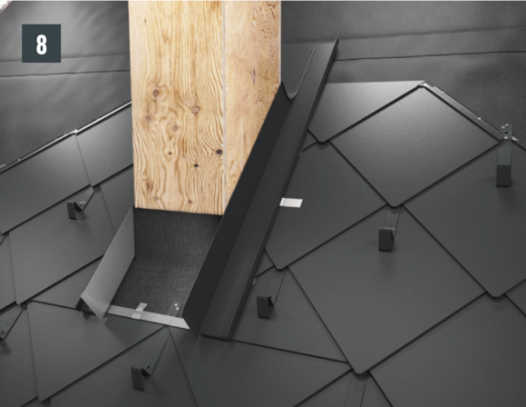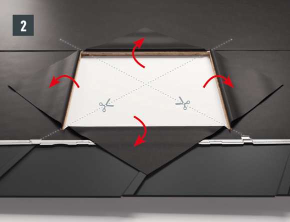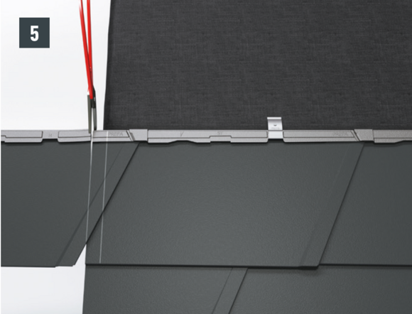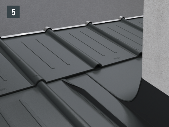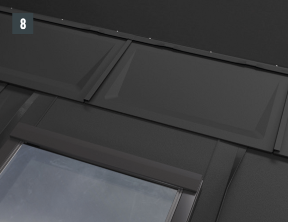 Bij het achterste deel van de omlijsting wordt de bovenste inhaakvouw van de te leggen dakpan R.16 of het te leggen dakpaneel FX.12 ca. 200 mm ingesneden en losgemaakt. De inhaakvouw wordt naar achteren omgebogen en de overstek aan de zijkant wordt 90° omhoog gebogen (afbeelding 5+6). Het bovenste deel van de omlijsting wordt geplaatst.