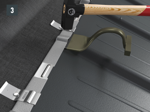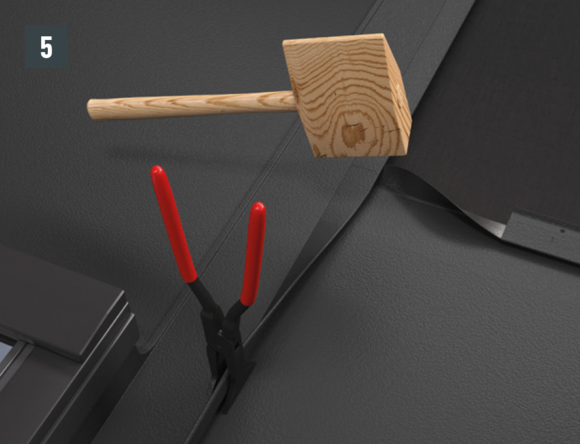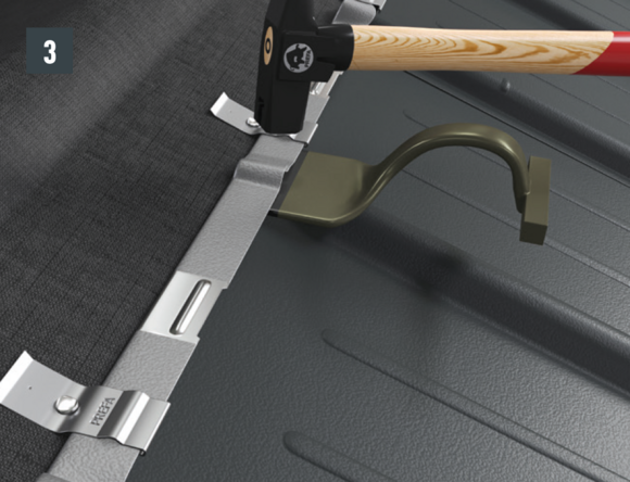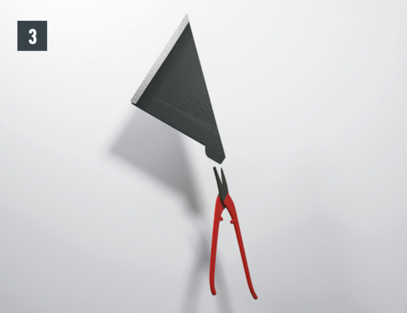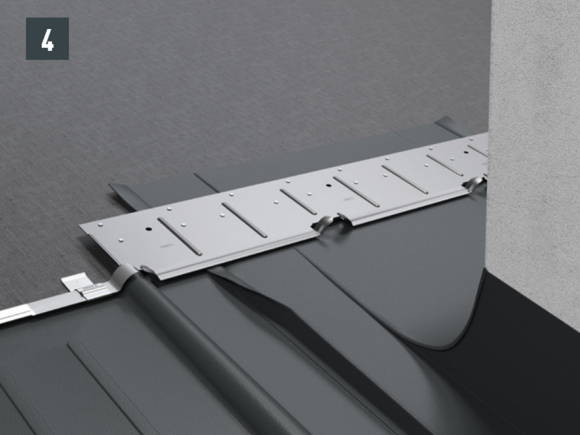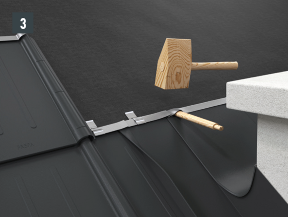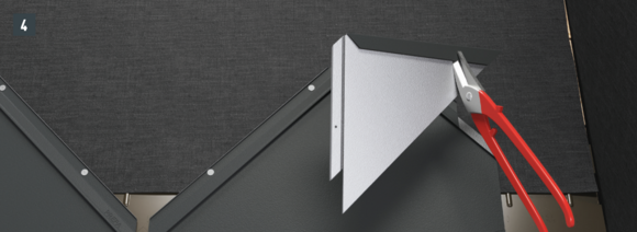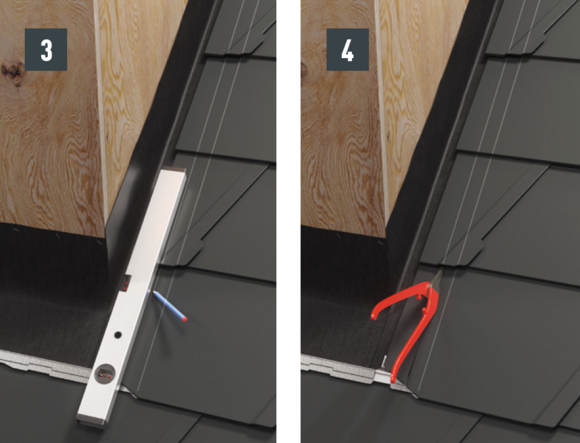Maak een inkeping in de bovenste vouw in het gebied van de opstaande rand, zodat een haakvouw overblijft en buig de dakpan R.16 of het dakpaneel FX.12 30 mm haaks op het dakvlak omhoog (afbeelding 3 en 4).