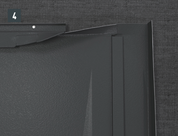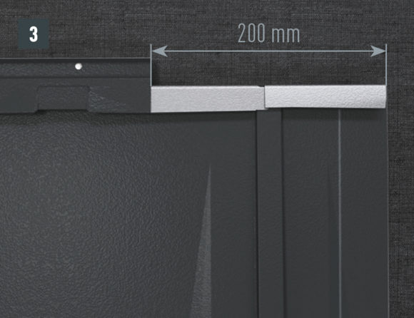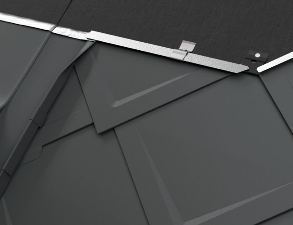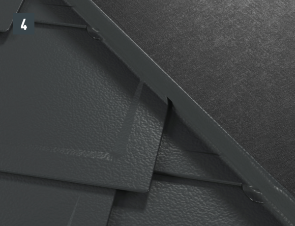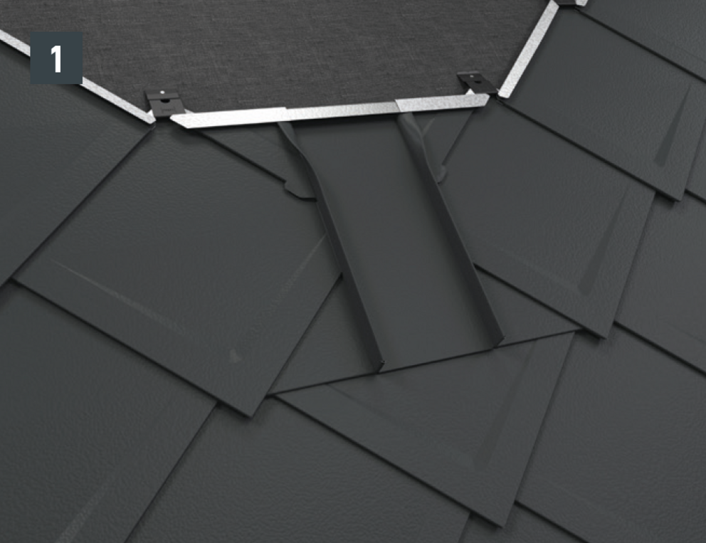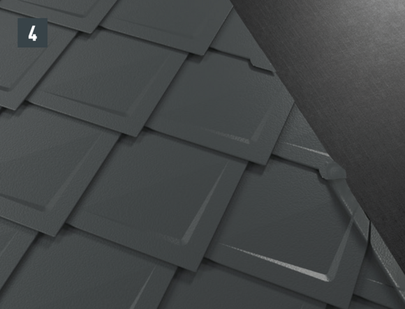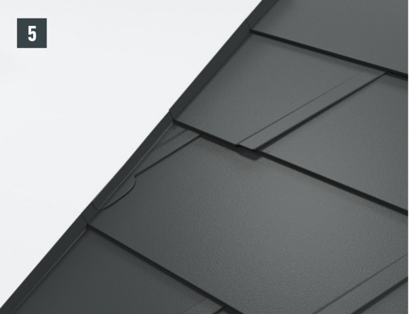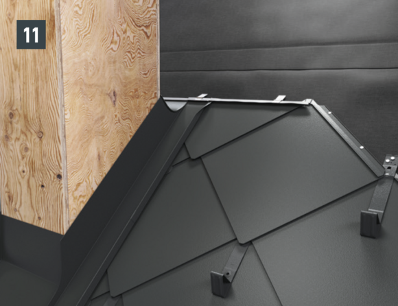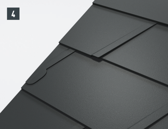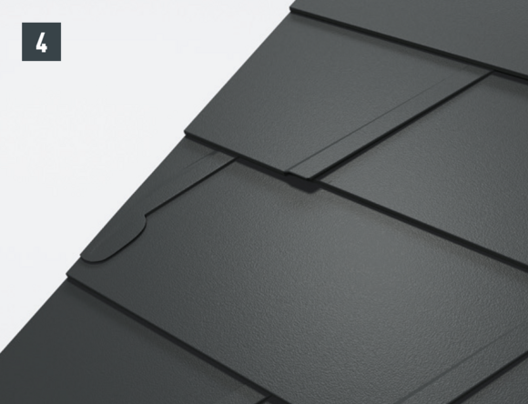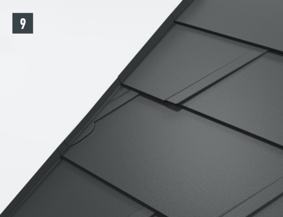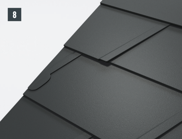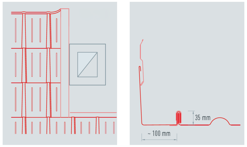 De lengte van het zijstuk is afhankelijk van alle dakelementen en vouwtoeslagen. Haak het zijstuk aan de onderkant in de PREFA-dakbedekking. In het bovenste gedeelte moet het zijstuk boven de bovenste dakpanomslag uitsteken.