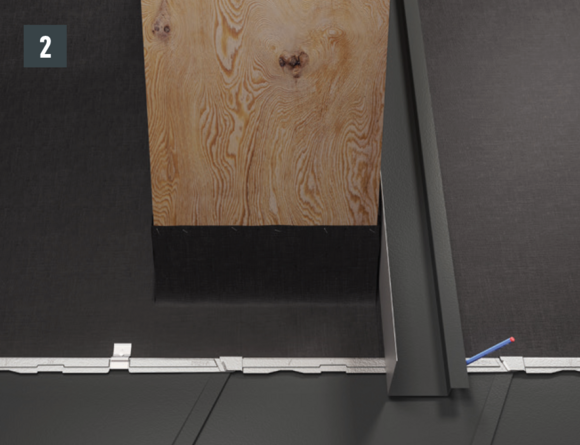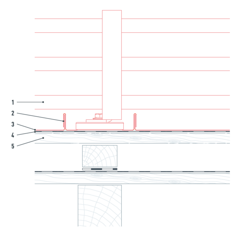 Als alternatief voor de doorvoerplaat om te felzen kan ook een steun in de steunplaat worden gefelst en deze kan in de dakbedekking worden bedekt. De aansluiting op de dakbedekking gebeurt net als bij de doorvoerplaat om te felzen door middel van opstaande naden (afbeelding 1+2).