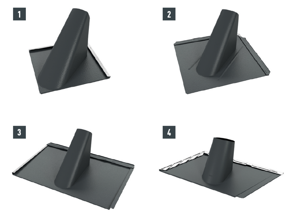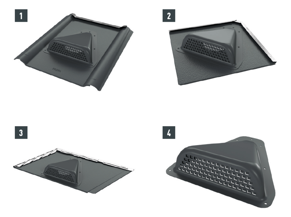 Doorvoerplaten voor daklosange 29 × 29 (1), daklosange 44 × 44 (2), dakpan R.16 en dakpaneel FX.12 (3) en dakschindel DS.19 (4) hebben de afmetingen van het betreffende PREFA-daksysteem en kunnen eenvoudig in de dakbedekking worden verwerkt.