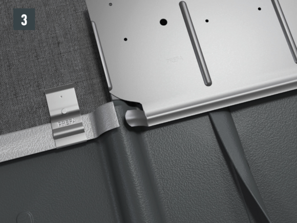 De lengte van het voorste deel is afhankelijk van alle dakelementen en vouwtoeslagen. Haak het voorste deel aan de onderkant in de PREFA-dakbedekking.
