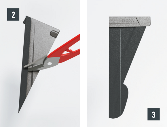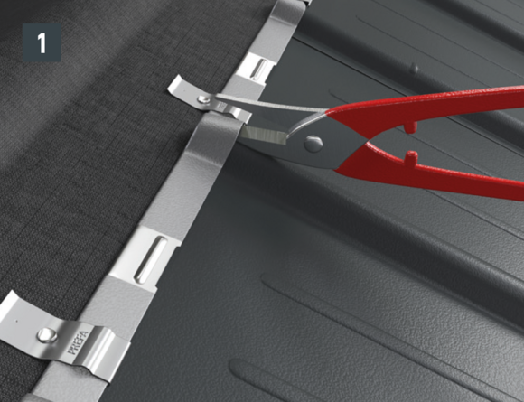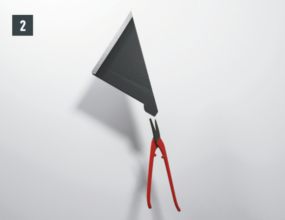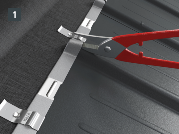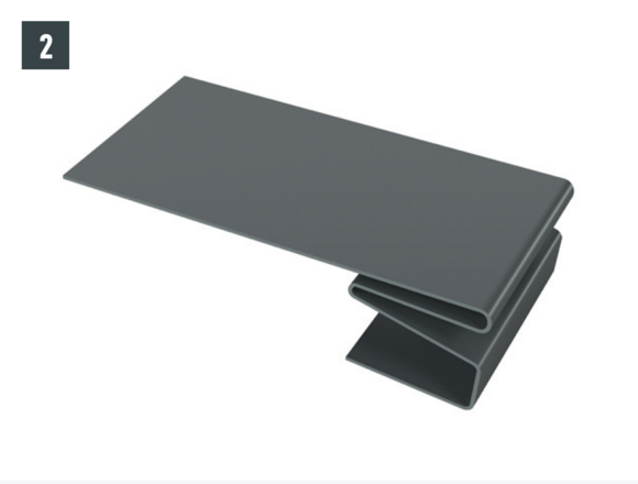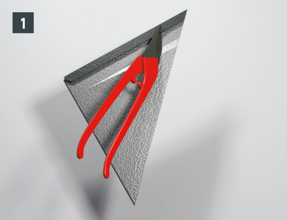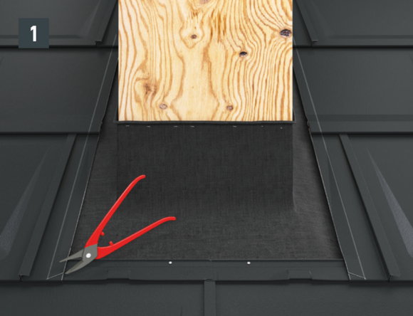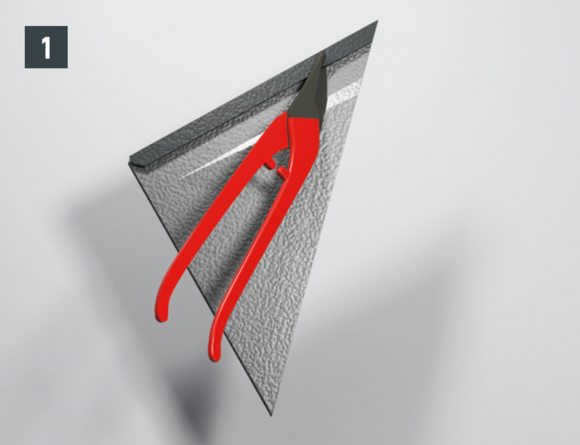 Maak een inkeping in de bovenste vouw in het gebied van de opstaande rand, zodat een haakvouw overblijft en buig de dakpan R.16 of het dakpaneel FX.12 30 mm haaks op het dakvlak omhoog (afbeelding 1 en 2).