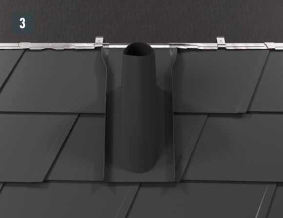 In het bovenste gedeelte moet het zijstuk boven de bovenste dakpanomslag uitsteken.