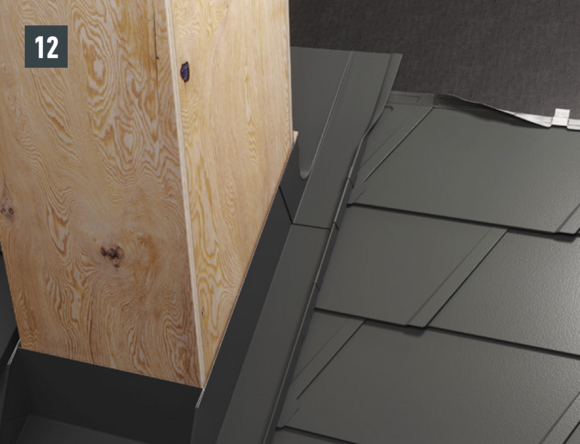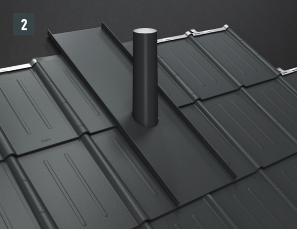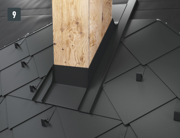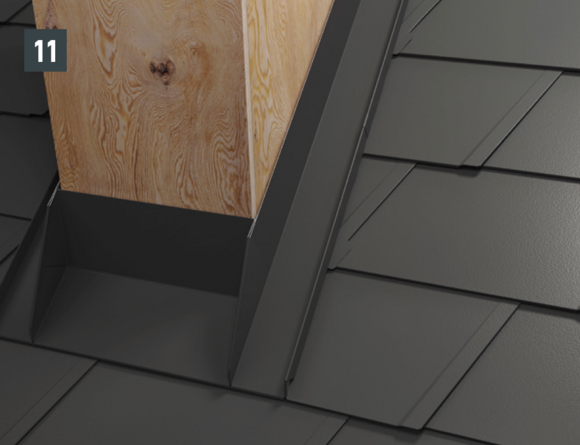Schoorsteenomlijstingen worden vakkundig en op voor plaatsers van metalen daken gebruikelijke wijze uitgevoerd. Bereid de staande naadverbindingen voor het bevestigen van de zijgoot voor door de PREFA-dakbedekking (30 mm) omhoog te buigen.