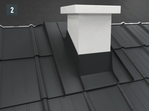 Dek de dakpan R.16 of het dakpaneel FX.12 zo ver omhoog tot de laatste rij van de PREFA-dakbedekking onder de schoorsteen kan worden doorgelegd.
