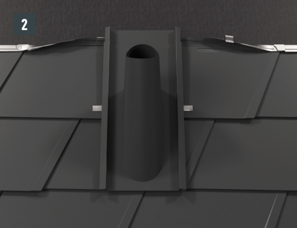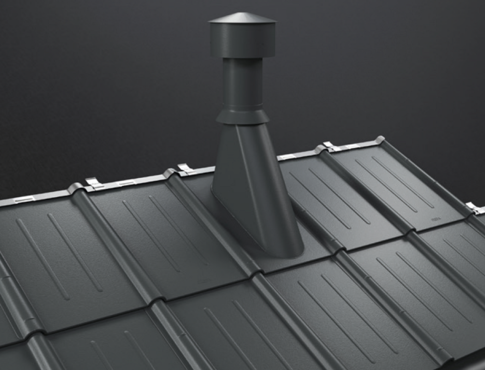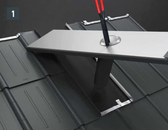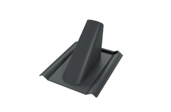 De doorvoerplaat voor dakpannen heeft de vorm van een halve dakpan met een ingefelste conische doorvoer.