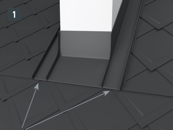 Voor de montage van de steunplaat moeten bij daklosanges van 29 × 29 of 44 × 44 begin- en eindlosanges worden gelegd. Deze maken een horizontale inhaakvouw mogelijk zodat de omlijsting een regenbestendige aansluiting krijgt (afbeelding 1).