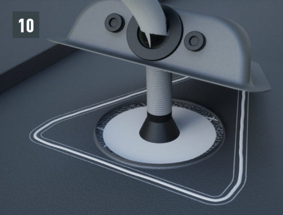 Rubberen onderdelen die aan beweging onderhevig zijn, moeten worden behandeld met de meegeleverde talk om de glij-eigenschappen te verbeteren. Om het plaatsen van het zonneluik te vereenvoudigen, raden we aan de gegolfde pijp eerst 90° in de richting van de dakrand te buigen. Inclusief doorvoerbuisjes 1 × Ø 32–35 mm en 2 × Ø 10 mm.