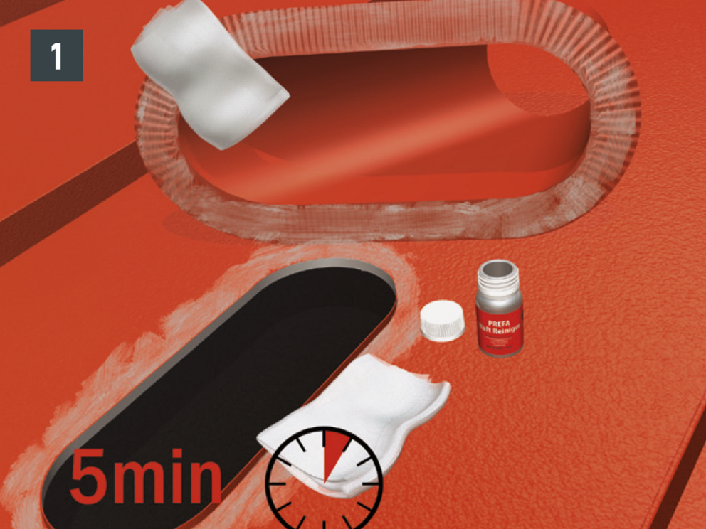 De lijmvlakken moeten worden opgeruwd (bijv. met schuurpapier) en vervolgens grondig worden gereinigd met de PREFA-reinigingsmiddel. De oppervlakken moeten droog, schoon en vetvrij zijn.