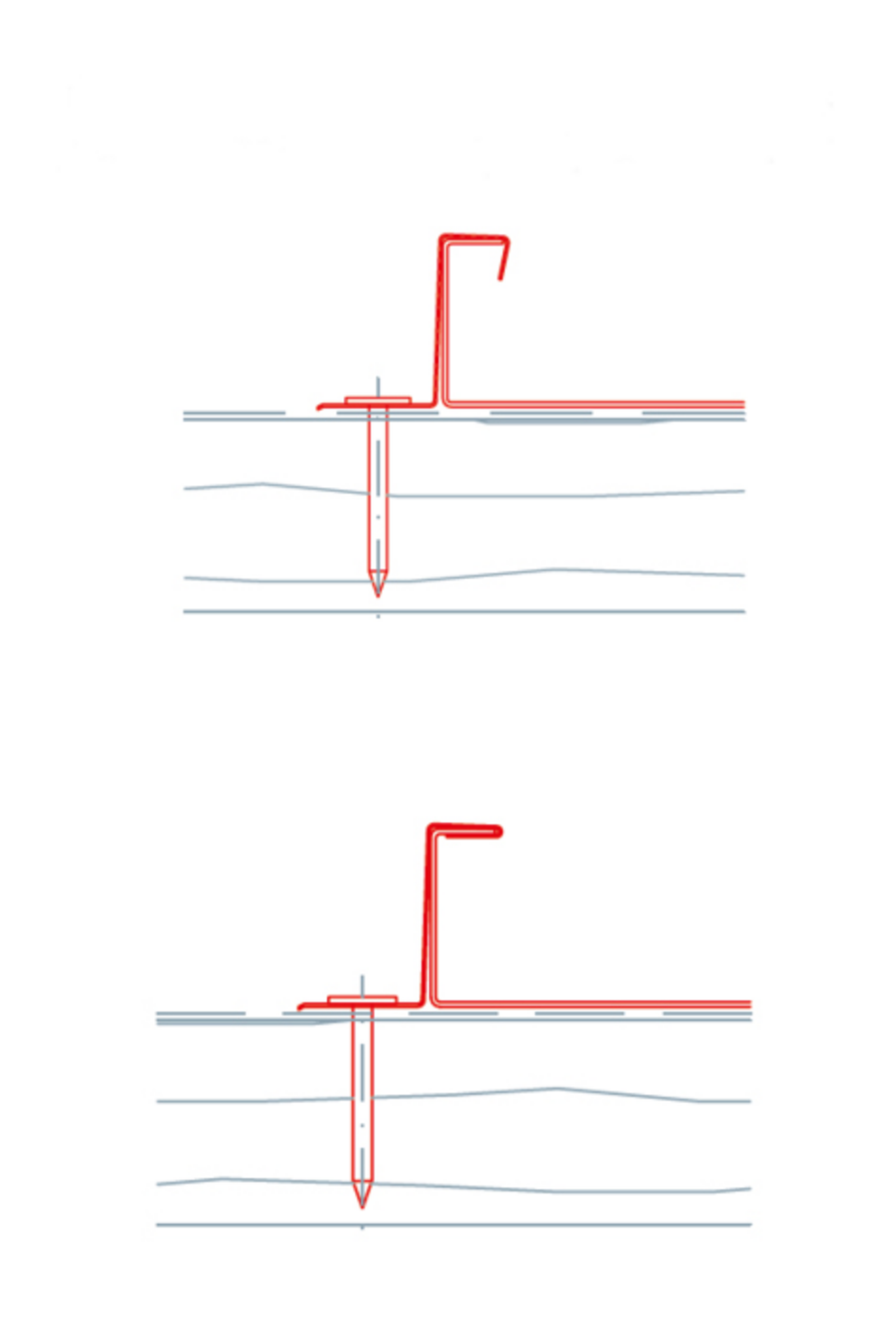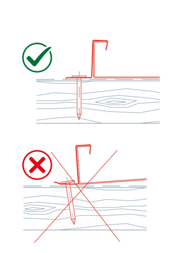 Let er bij het bevestigen van de PREFA rvs vaste klangen, schuifklangen en lange schuifklangen op dat de spijkers voor de bevestiging voldoende verzonken zijn en niet boven de gegroefde rand uitsteken om druk- en schuurplekken in de verlegde dakbedekking te vermijden. Voor de bevestiging van PREFA vaste klangen moeten per klang 2 st. PREFA rvs spijkers worden gebruikt. Voor de bevestiging van PREFA schuifklangen en lange schuifklangen moeten per klang 3 stuks PREFA rvs spijkers worden gebruikt.