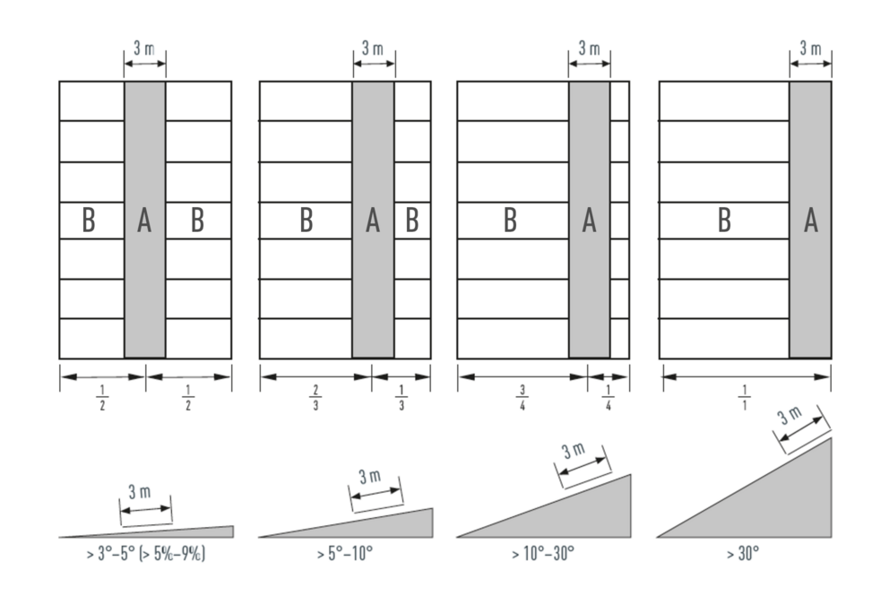 De lengte van het gebied van de vaste punten moet 3 meter bedragen. De positie van het gebied van de vaste punten dient altijd te worden gekozen afhankelijk van de dakhelling – zie onderstaande afbeelding en de bijbehorende tabel. Dakdoorvoeren of de vorm van het dak kunnen de plaats waar de klang mag worden geplaatst, beïnvloeden. Gebieden met verschillende plekken waar de klangen mogen worden geplaatst, dienen door scheidingsstroken te worden gescheiden.