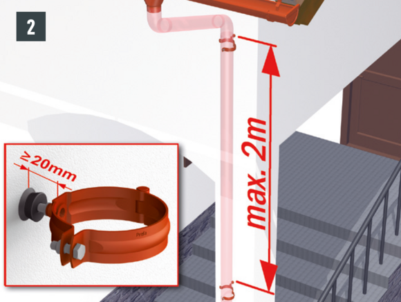 De pijpbeugels dienen zo te worden gemonteerd dat er een afstand van minimaal 20 mm is tussen de achterzijde van de buis en de gevel. De afstand tussen de pijpbeugels onderling mag niet meer zijn dan 2 meter. (Nationale normen en vakregels kunnen grotere afstanden toestaan. Vanwege de lengte van de PREFA regenpijpen van 3 m is een afstand van max. 2 m in de praktijk haalbaar gebleken.)