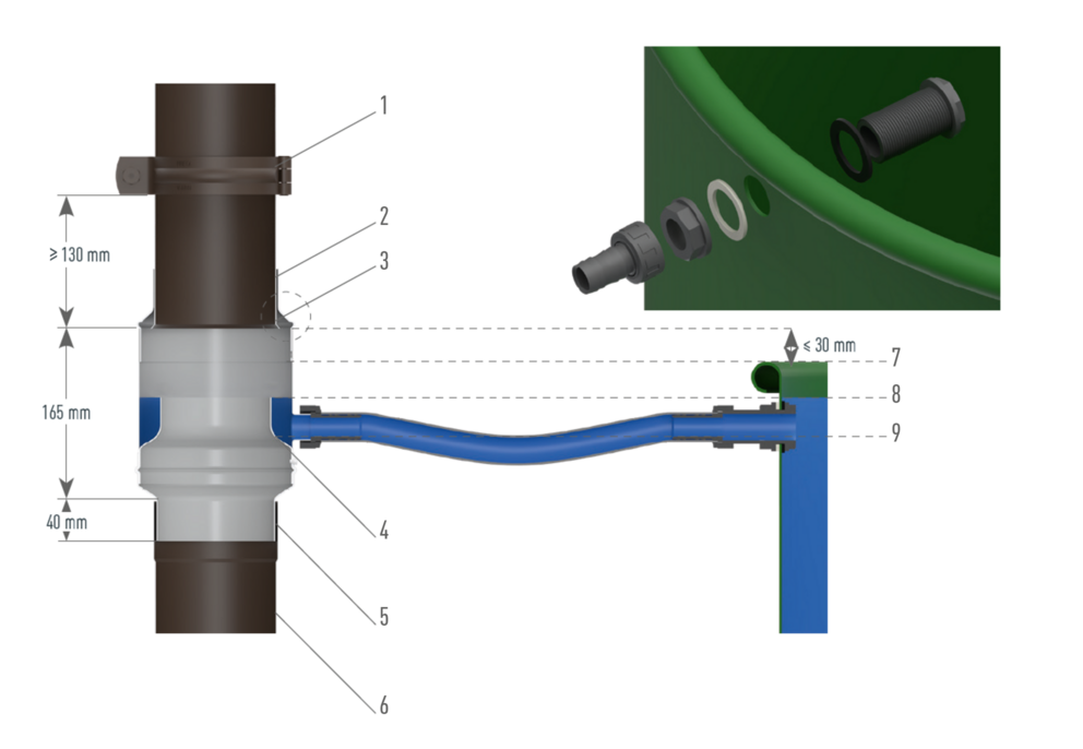 Dankzij de regenwaterverzamelaar wordt de regenton bij neerslag direct via de afvoerbuis gevuld met regenwater. Het water wordt tot de gewenste hoogte opgevangen.
