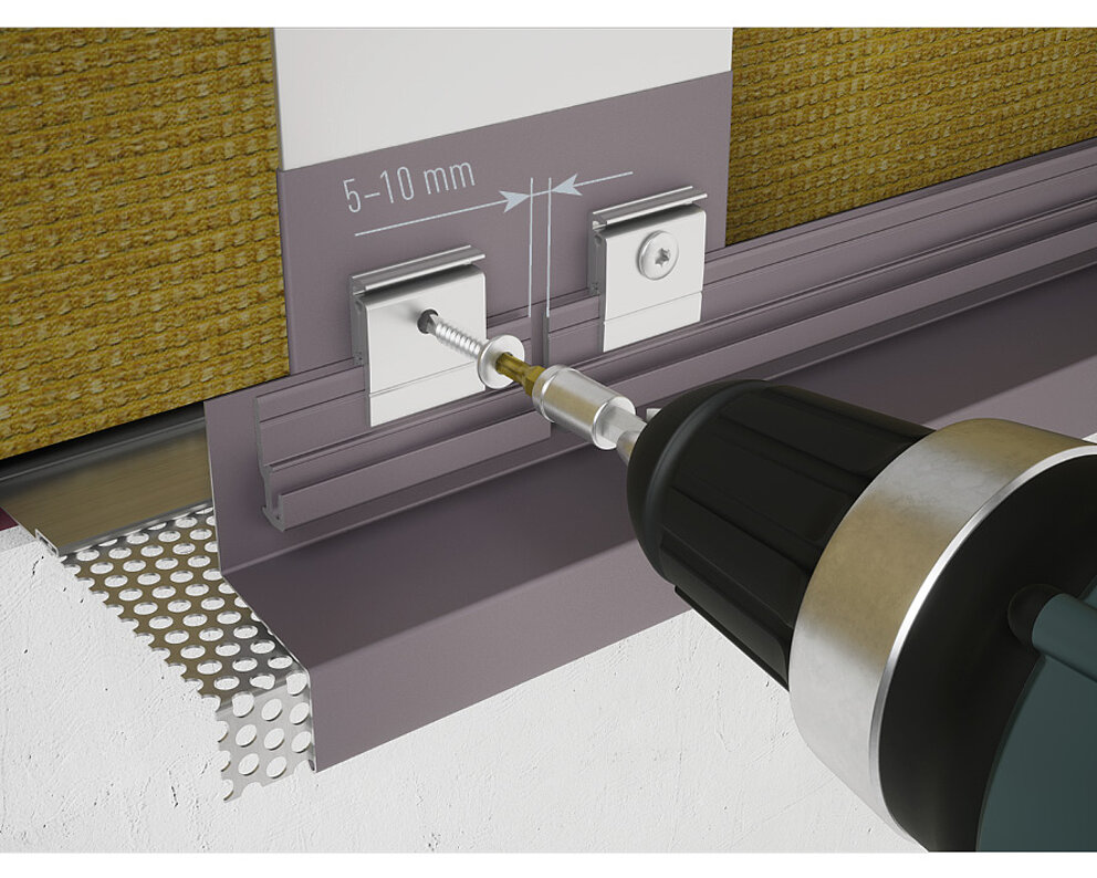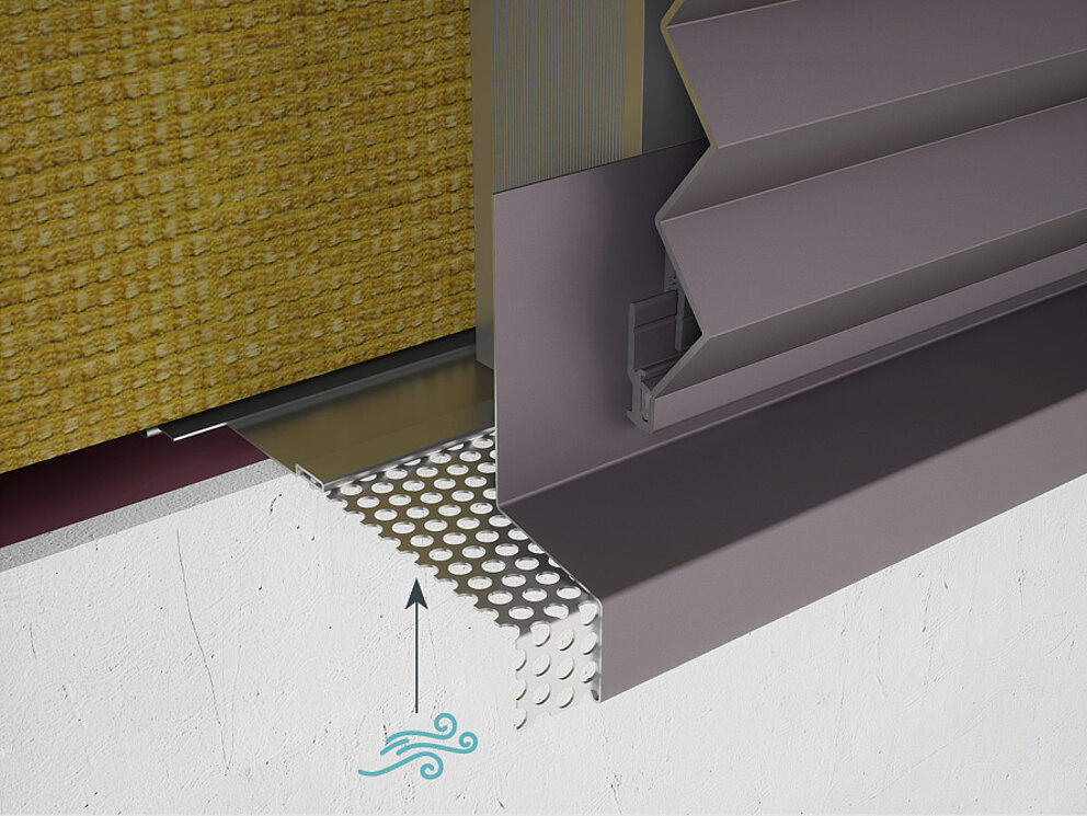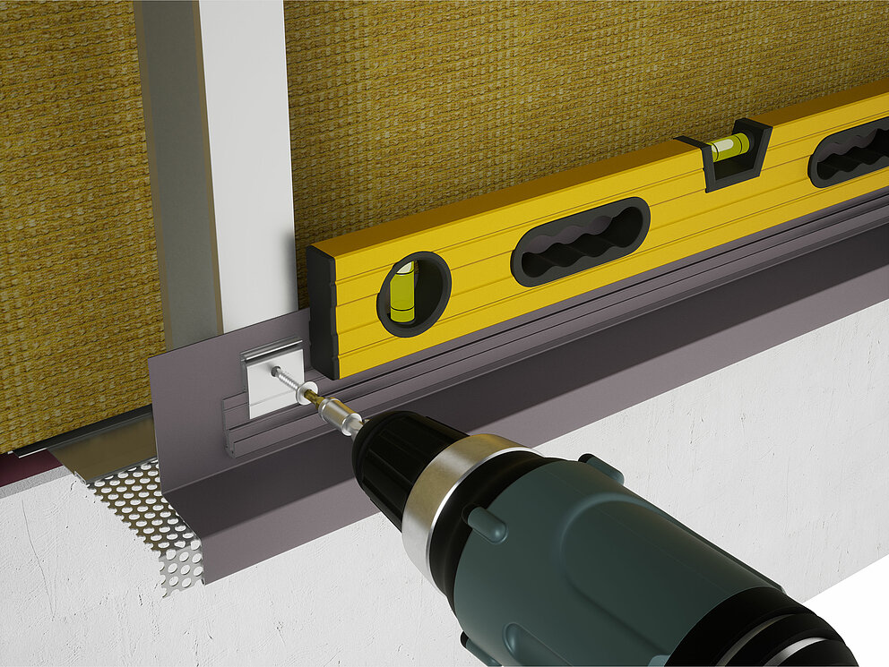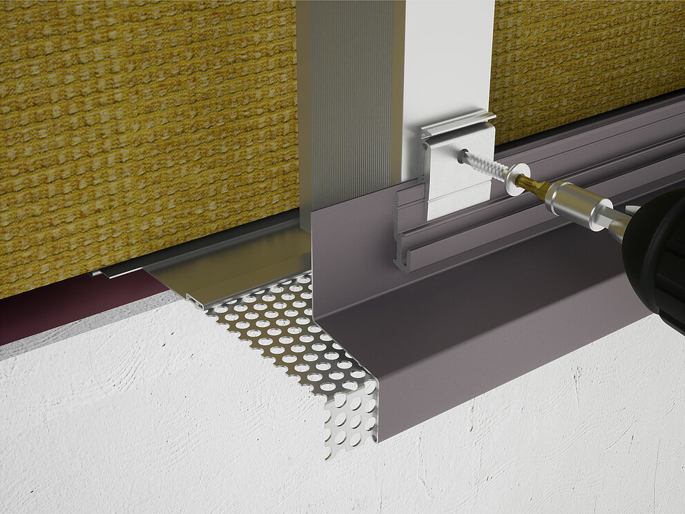 Als de voorbereidingen voor de aansluitingen voor de sokkels van de geventileerde voorhanggevel (geperforeerde plaat en afdekstrips) zijn getroffen, kan de montage met het startprofiel beginnen. Het startprofiel is altijd het eerste profiel voor de bouw van een gevel met geëxtrudeerde profielen.