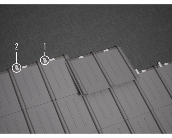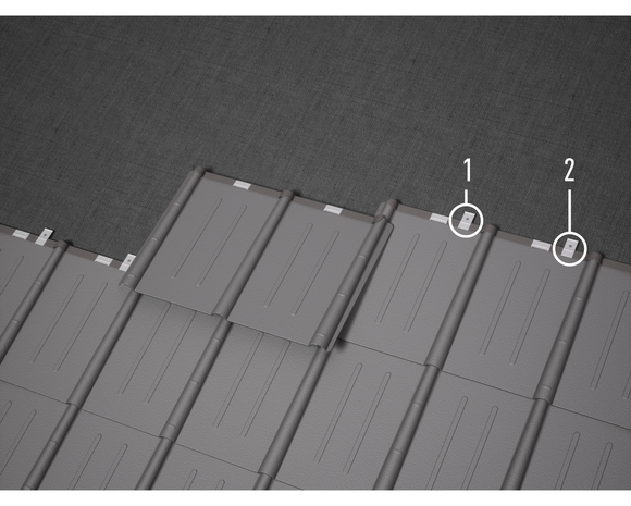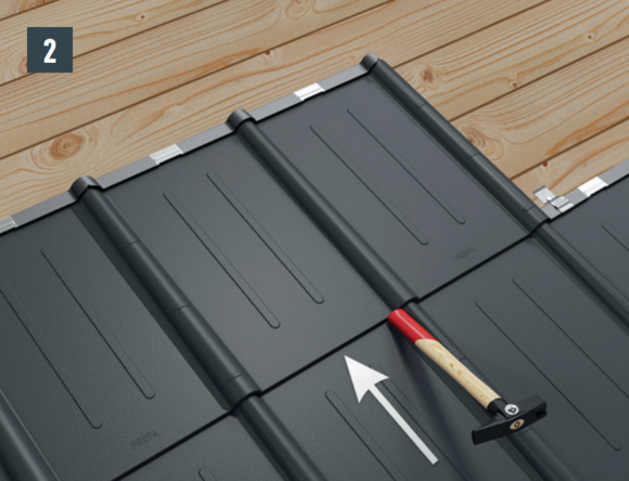 Druk de dakpan in de vouw om deze vast te haken. Sla met het handvat van de hamer licht tegen de onderkant van de dakpan (afebbelding 1).
