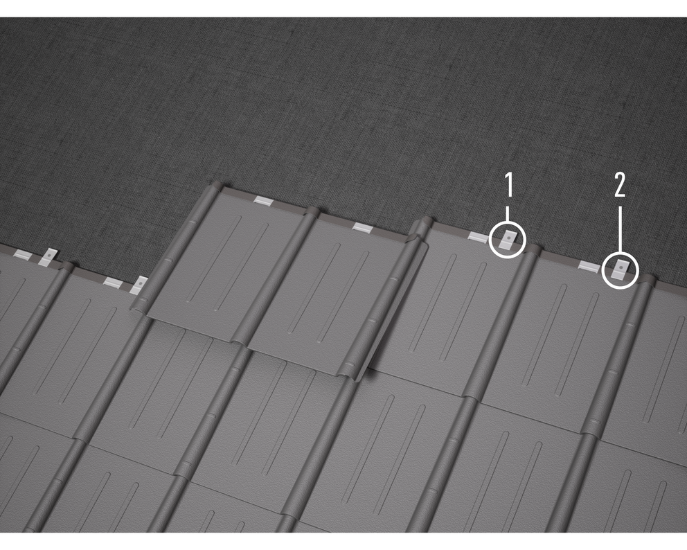 De klangen moeten ca. 3 cm naast de groef van de dakpan worden geplaatst. In gebieden die bijzonder gevoelig zijn voor stormen, is een windbelastingberekening vereist en dient de bevestiging volgens de berekening te worden verbeterd of dienen geschroefde in plaats van gespijkerde bevestigingen te worden gebruikt. Als de bevestiging met een hoger aantal klangen volgens berekening niet voldoende is, kan bovendien een directe bevestiging aan de zijkant van de golf (onderliggende golf) worden bevestigd met 2 stuks SPAX-schroeven per plaat aangebracht worden.