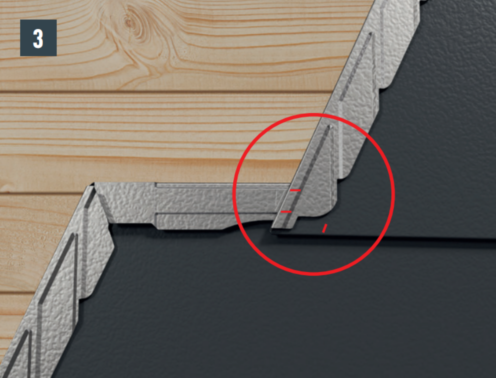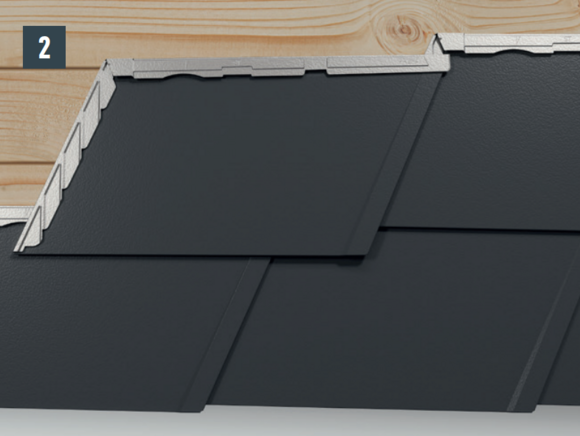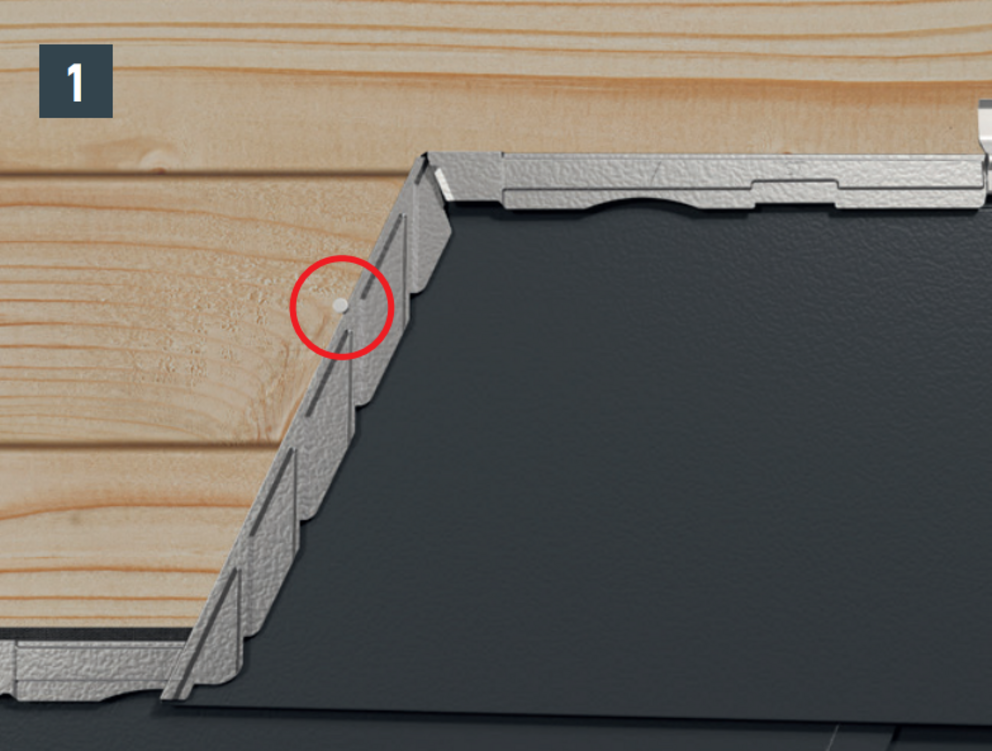 Door de vorm van de dakschindel DS.19 ontstaat rechtsonder van de dakschindel DS.19 een verlaging. Houd deze verlaging ook tijdens de montage van de eerste dakschindel DS.19 in elke rij aan, door de eerste dakschindel DS.19 niet helemaal tot boven in het startprofiel of vouw te schuiven. Laat de achterzijde van de eerste dakschindel DS.19 zo ver afhellen totdat de bovenste schindelomslag over de volle lengte recht doorloopt. Er mag niet over de eerste dakschindel DS.19 heen worden gelegd.