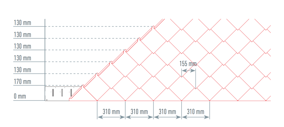 Als hulpmiddel voor het leggen van de PREFA-gevellosanges van 20 × 20 is het raadzaam om een raster van verticale lijnen op een afstand van 310 mm te maken (als hulpmiddel dienen de markeringen in het startprofiel). Om in elke rij precies aan de snoermaat te voldoen, kan indien nodig ook de helft van de snoermaat worden gemarkeerd en met regelmatige tussenpozen worden gecontroleerd. Lijn de eerste losanges met de inkepingen (aan de bovenzijde van de eerste losanges) uit met de verticale lijnen (afbeelding 21). De markeringen op het startprofiel zijn niet voor de gevellosange 20 × 20 bepalend. Let er hierbij op dat het gebied voor de opstaande rand aan de zijkant (bijv. zijdelingse afsluiting of gebouwhoeken) niet in het midden van de gevellosange van 20 × 20 ligt (symmetrie gevelvlak in acht nemen).