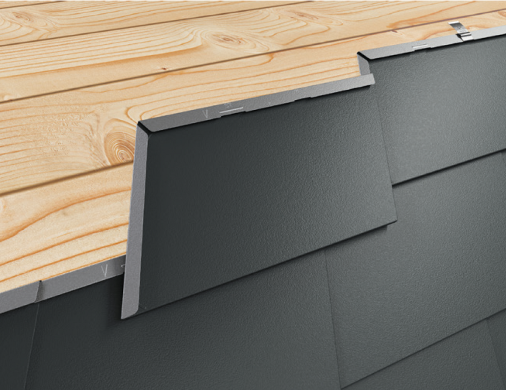 Door de vorm van de gevelschindel ontstaat aan de achterzijde van de gevelschindel een verlaging. Houd deze verlaging ook tijdens de montage van de eerste gevelschindel in elke rij aan, door de eerste gevelschindel niet helemaal tot boven in het startprofiel of vouw te schuiven. Laat de achterzijde van de eerste gevelschindel zo ver afhellen totdat de bovenste omslag van de schindel over de volledige lengte recht doorloopt. Er mag niet over de eerste gevelschindel heen worden gelegd. Zorg ervoor dat bij aansluiting op de kielgoot de bovenste omslag van de schindel over de volle lengte recht doorloopt.