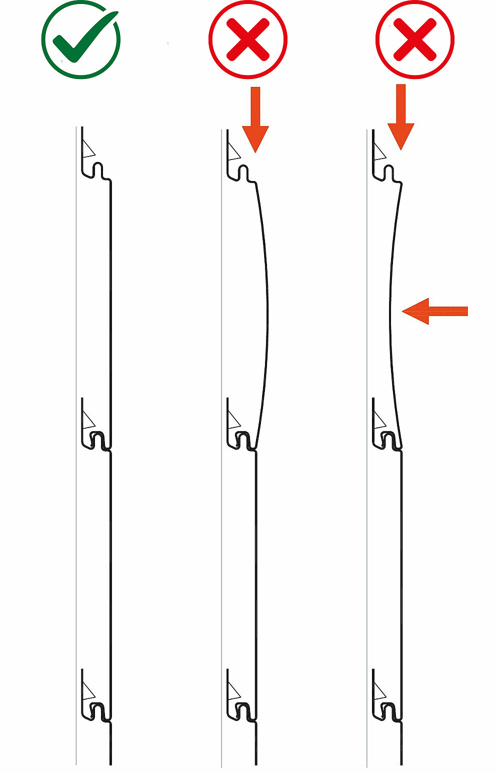 Let erop dat de montage in drukvrije toestand moet plaatsvinden. Steek Siding, Siding.X en Siding geperforeerd niet te stevig onder druk in elkaar, aangezien dit tot spanningen kan leiden. De Sidings moeten absoluut vlak tegen de onderconstructie aan liggen om concave of convexe vervorming van de Sidings te voorkomen.