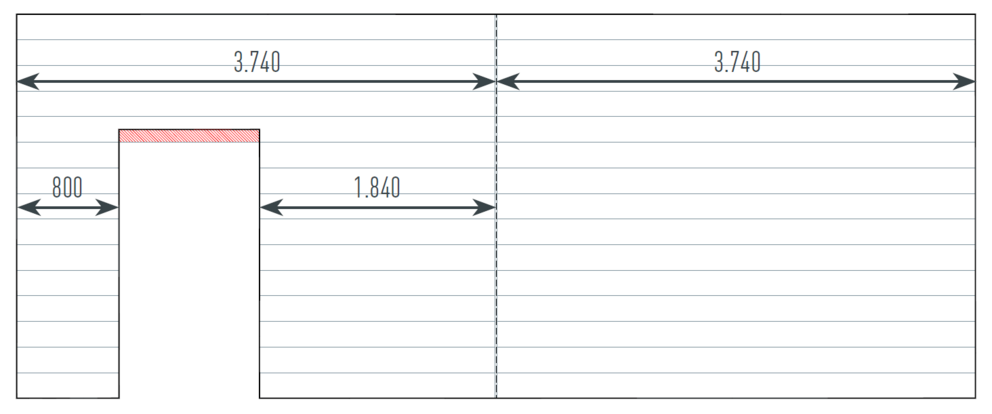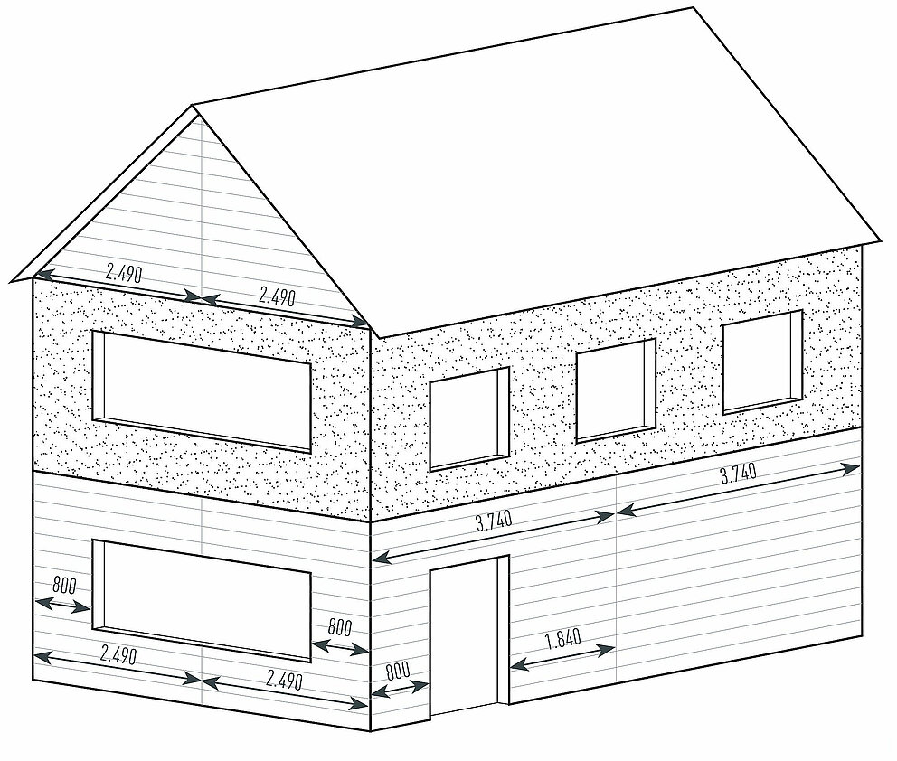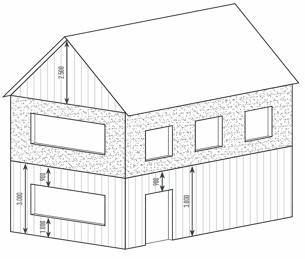 Uitsparingen zoals bijv. ramen of deuren die gedeeltelijk in een Siding steken, worden bij de materiaalbepaling buiten beschouwing gelaten en ter plaatse aangepast (rood gemarkeerd gebied).