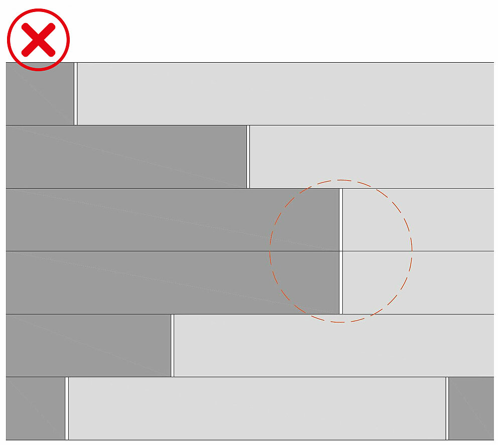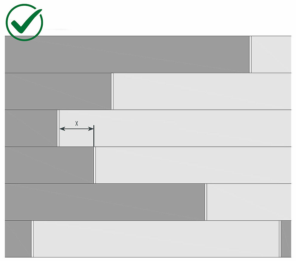 PREFA raadt aan om voor de verspringing (x) minimaal een afstand te kiezen die overeenkomt met de geïnstalleerde bouwbreedte (BB) (bijv. met Siding 138×0,7 mm = min. verspringing 138 mm):