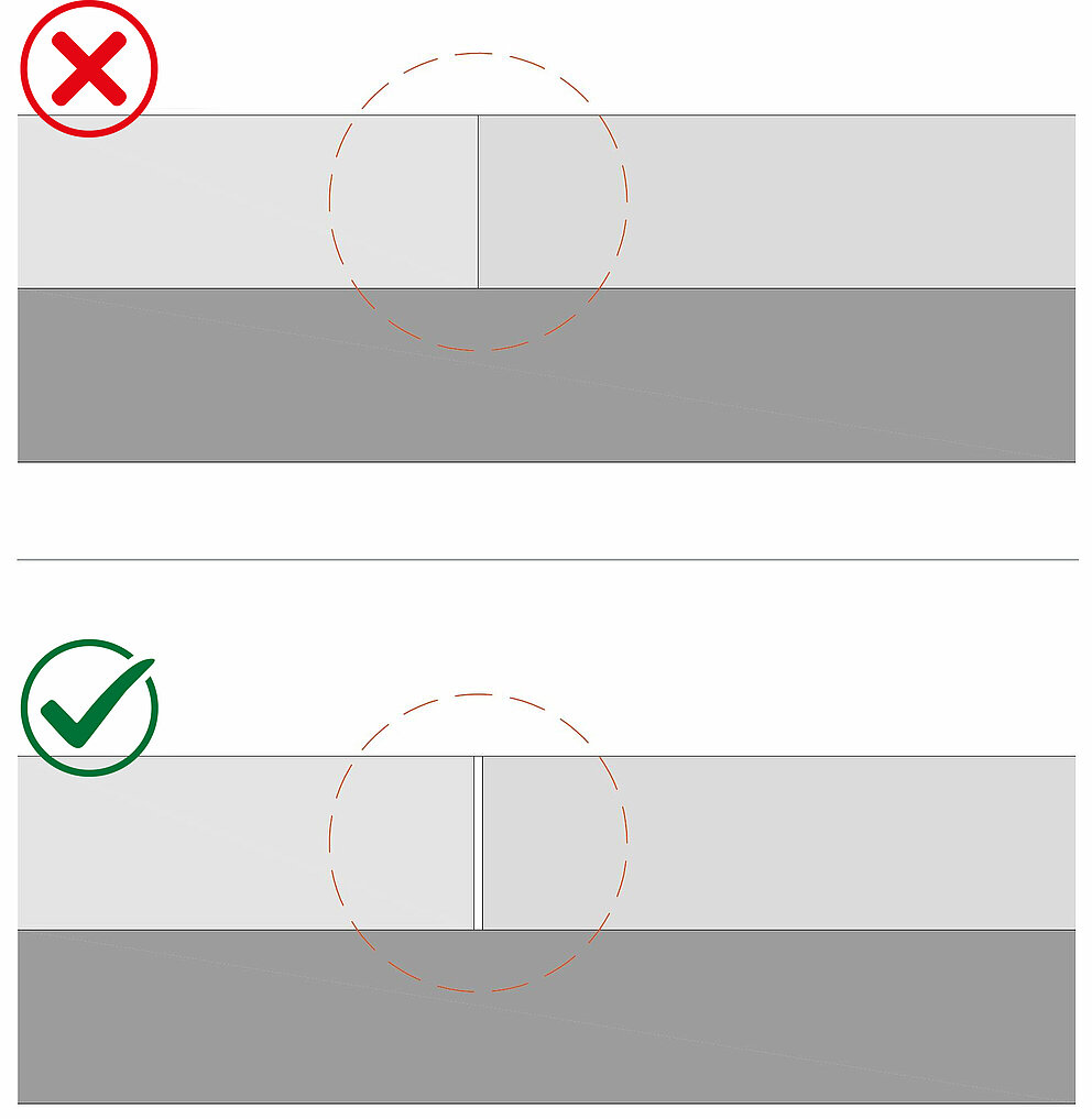 De montage kan horizontaal en verticaal met een max. Siding-lengte van 2500 mm plaatsvinden. De breedte van de PREFA-kopvoeg komt overeen met de schaduwvoeg van 15 mm en kan onafhankelijk van de onderconstructie worden gemonteerd. De voeg van twee Sidings zonder PREFA-kopvoeg wordt niet aanbevolen, omdat de materiaaluitzetting niet zonder beperkingen kan worden opgevangen.