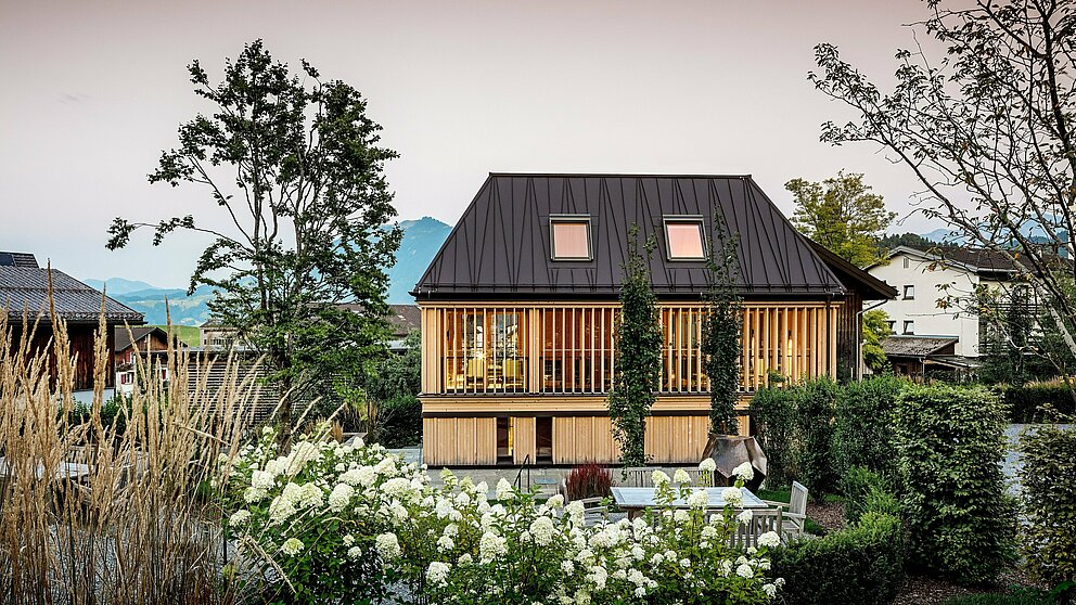 De architecten beoogden met hun ontwerp voor het badhuis een harmonieus drieluik te creëren. Met respect voor de traditie, de topografie en het terrein gingen ze aan de slag en kwamen tot een innovatieve interpretatie van een typisch huis uit het Bregenzerwald. De prominente zichtbaarheid van het dak in het historische dorpscentrum weerhield NONA er niet van om een heel eigen visie te ontwikkelen: “We wilden absoluut dit dak voor het gebouw”, vertelt architect Anja Innauer over het PREFA dak met staande naad met een hellingsgraad van 60° en atypisch lopende staande naden, deels schuin over het dakoppervlak. Het was een gewaagd idee dat op scepsis werd onthaald. De architecten hielden voet bij stuk. Samen met hun bouwcoördinatoren Flatz & Jäger konden ze de opdrachtgevers, omwonenden en vaklui warm maken voor hun moedige ontwerp dat een hedendaagse invulling geeft aan een traditionele vormentaal.