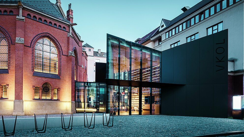 Das Bild zeigt eine faszinierende Verbindung von historischer und zeitgenössischer Architektur in Olmütz. Auf der linken Seite steht die majestätische Rote Kirche mit ihren charakteristischen gotischen Fenstern und roten Backsteinmauern, während der Neubau auf der rechten Seite mit seiner modernen schwarzen PREFABOND Aluminium-Verbundplatten-Fassade kontrastiert. Die gläserne Front des Neubaus gewährt einen Einblick in die innovative Bibliotheksgestaltung und verleiht dem Ensemble einen eleganten, offenen Charakter. Die präzise Verarbeitung der PREFABOND-Platten sorgt für ein einheitliches Erscheinungsbild, das sich harmonisch in die historische Umgebung einfügt und gleichzeitig ein modernes Statement setzt. Die Architektur dieses Projekts verbindet perfekt Tradition und Innovation, wobei die Materialien nicht nur ästhetisch überzeugen, sondern auch für Langlebigkeit und Nachhaltigkeit sorgen.