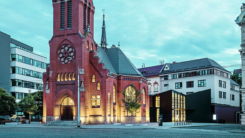 Wie Olomouc te voet doorkruist, ervaart meteen de bijzondere sfeer in het historische centrum en de wijk met de Rode Kerk en de Wetenschappelijke Bibliotheek. Precies hier werd in 2023 een nieuwbouw gerealiseerd die beide gebouwen verbindt. Atelier-r, s.r.o vulde dit karaktervolle stadsgedeelte aan met een bouwvolume dat de historische omgeving in acht neemt en tegelijk een hedendaagse taal introduceert. Architect Miroslav Pospíšil omschrijft het ontwerp als een constructie tussen verleden en heden, waarbij het beeld van de kerk ongewijzigd bleef en de nieuwbouw een rustige, eigen uitstraling kreeg.