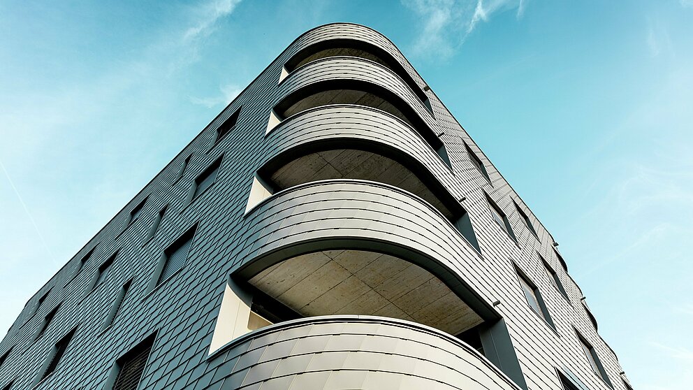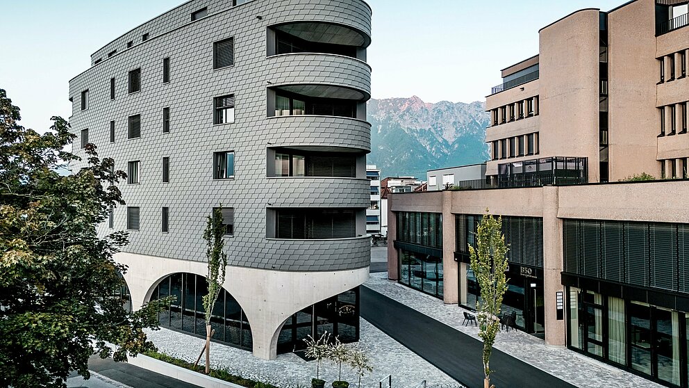 De nieuwbouw combineert een solide massiefbouw met een buitengewoon ontwerp. Dat ligt enerzijds aan de driehoekige vorm met afgeronde hoeken. Anderzijds is de metalen gevel die als een schubachtige reptielenhuid rond het gebouw zit een echte blikvanger. De kleine PREFA gevelschindels in P.10 lichtgrijs waren een goede keuze. Ze geven het gebouw cachet. Bovendien konden ze dankzij hun formaat ook over de afgeronde hoeken worden geplaatst. “Direct achter het gebouw beginnen traditionele Zwitserse eengezinswoningen en die zijn bij ons bekleed met schindels”, motiveert Keller zijn beslissing om PREFA gevelschindels te gebruiken.