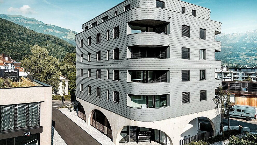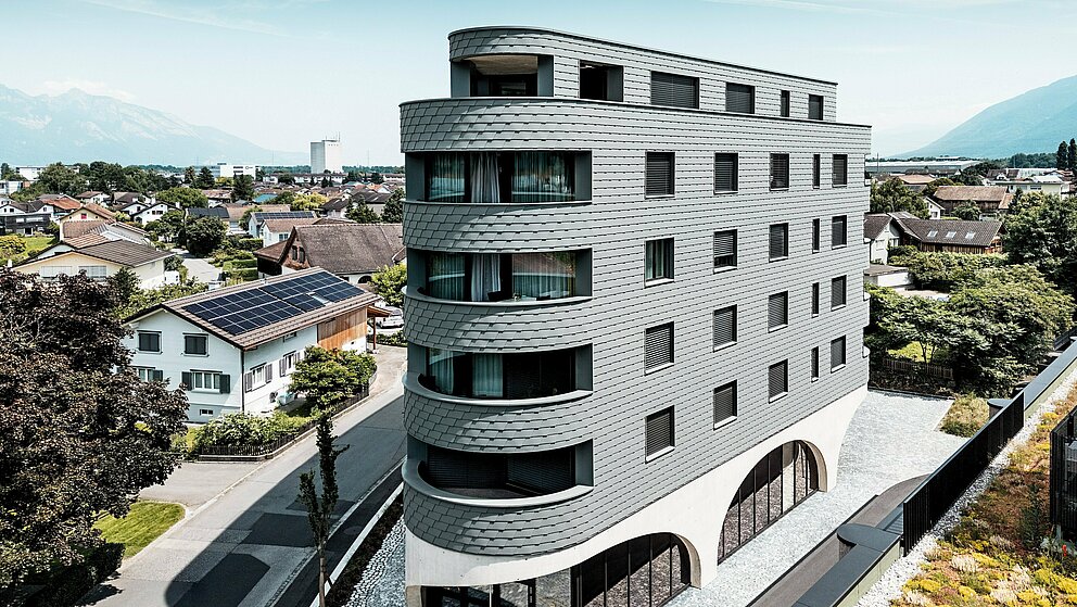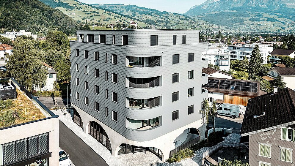 “Een knap ontwerp, maar technisch een grote uitdaging”, vertelt Gabriel Landolt van Künzli Davos. Het Zwitserse bedrijf, dat al vele jaren ervaring heeft met PREFA producten, plaatste de schubachtige gevelbekleding. “We werken zeer graag met aluminium, want het materiaal is zeer licht en toch weerbestendig. Je kunt er een homogeen oppervlak mee creëren dat stilistisch tijdloos en tegelijk duurzaam is. Zoals alle PREFA producten zijn de gevelschindels die we in Buchs gebruikten onderhoudsarm. Bovendien is aluminium een materiaal dat bijzonder goed te recyclen is.”