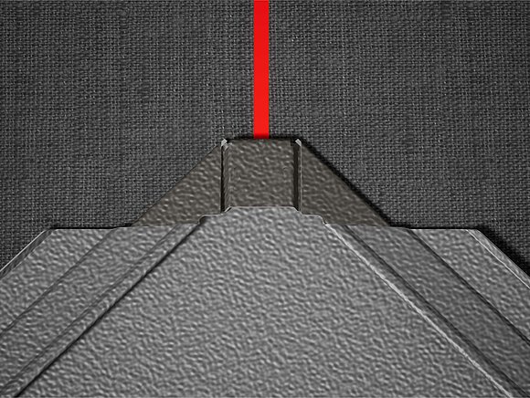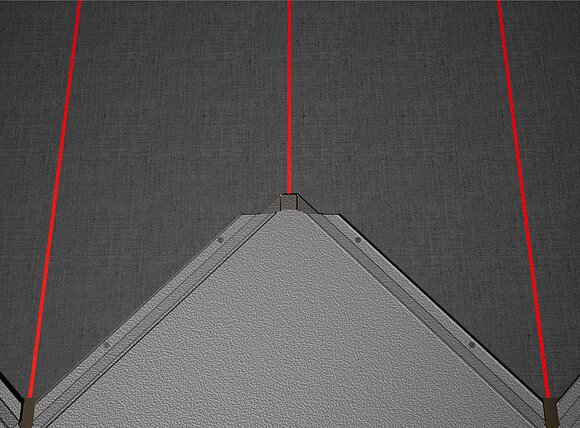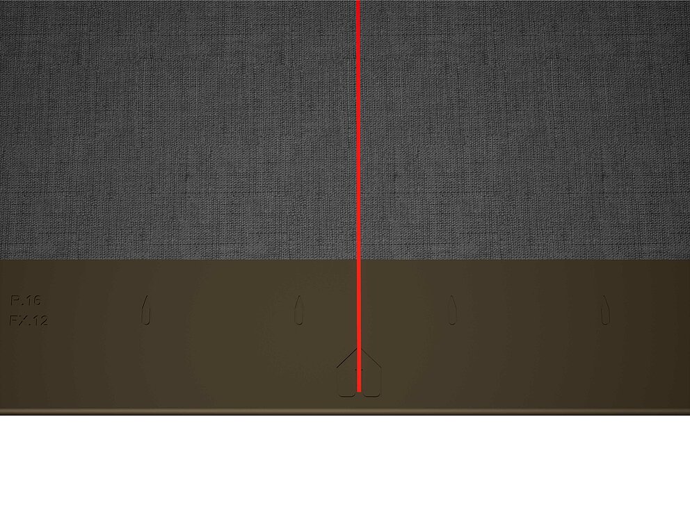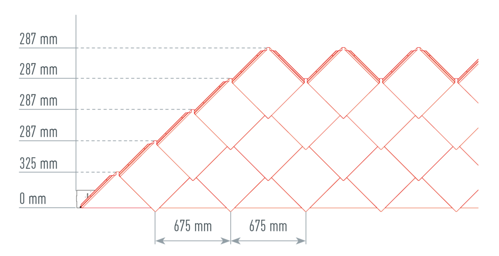 Als hulpmiddel voor het leggen van de PREFA-daklosanges van 44 × 44 is het raadzaam om een raster van verticale lijnen op een afstand van 675 mm te maken (als hulpmiddel dienen de markeringen in het startprofiel). Om in elke rij precies aan de snoermaat te voldoen, kan indien nodig ook de helft van de snoermaat worden gemarkeerd en met regelmatige tussenpozen worden gecontroleerd. Lijn de eerste losanges met de markeringen (aan de bovenzijde van de eerste losanges) uit met de verticale lijnen (zie onderstaande afbeelding). Let er hierbij op dat het gebied voor de opstaande rand aan de zijkant (bijv. vorming windveer) niet in het midden van de daklosange van 44 × 44 ligt (let op de symmetrie/het midden van het dak).