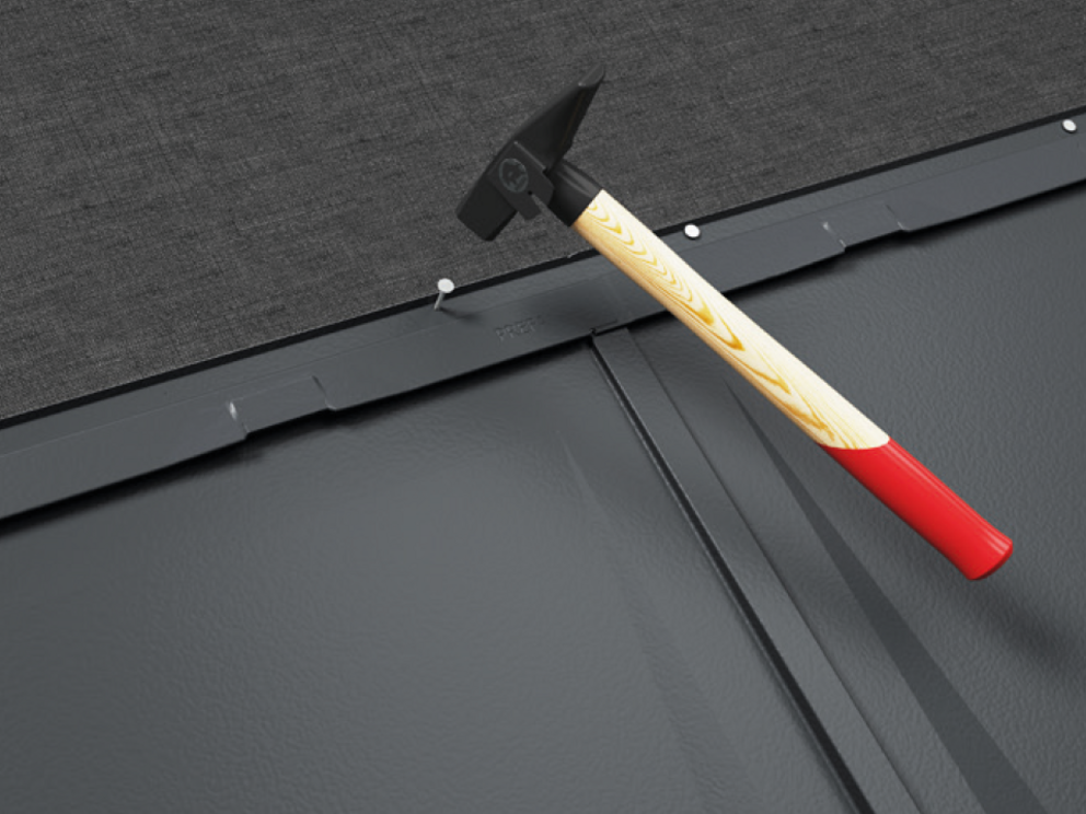 Bevestig de dakpannen R.16 met de meegeleverde PREFA-ribnagels 2,8/25 (basisbevestiging 3 st. per dakpan R.16). Voor PREFA-dakbedekkingen over meerdere bitumen lagen (bijvoorbeeld bitumen schindels) hebt u langere ribnagels nodig (bijv. 2,8/40). Geef dit bij de bestelling a.u.b. apart aan.