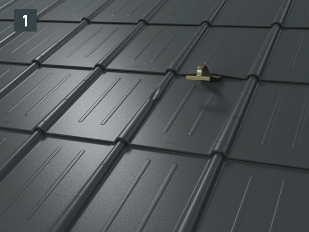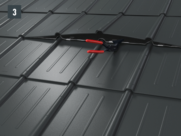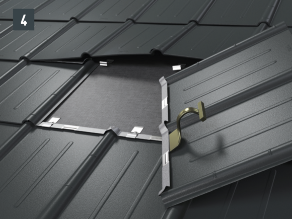 • Open de bovenste vouw van de nieuwe dakpan ietwat zodat de klangen kunnen worden vastgeklikt of de nieuwe dakpan in de vouw kan worden geschoven (afbeelding 4).