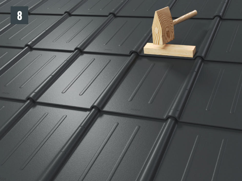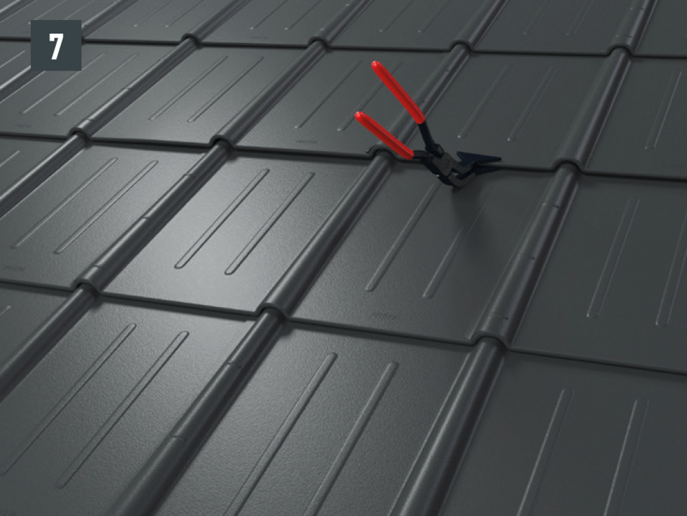 • Druk beide vouwen voorzichtig samen met de gebogen vouwtang. Bewerk de bovenste vouw van de dakpan met een hamer en een tang (afbeelding 7).