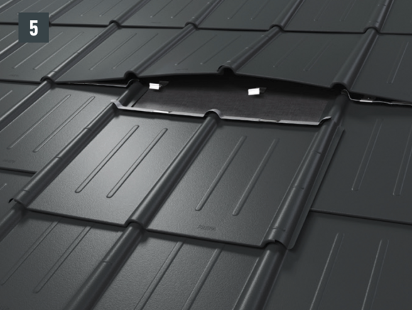 • Voordat u de nieuwe dakpan erin schuift beide buitenste groeven zekeren en de bovenste vouw ietwat openen. De nieuwe dakpan kan met beide zijgroeven over de andere worden gelegd (afbeelding 5). Uitzondering: in het gebied van de kielgoot of nok.