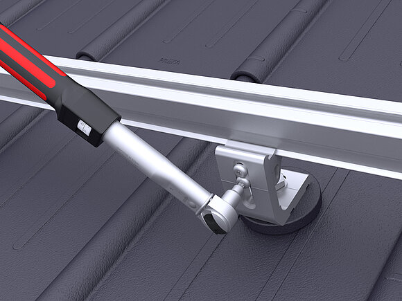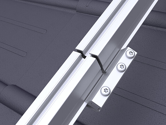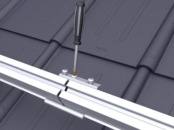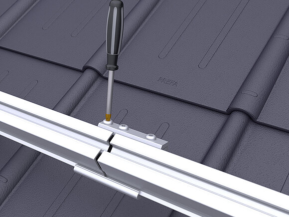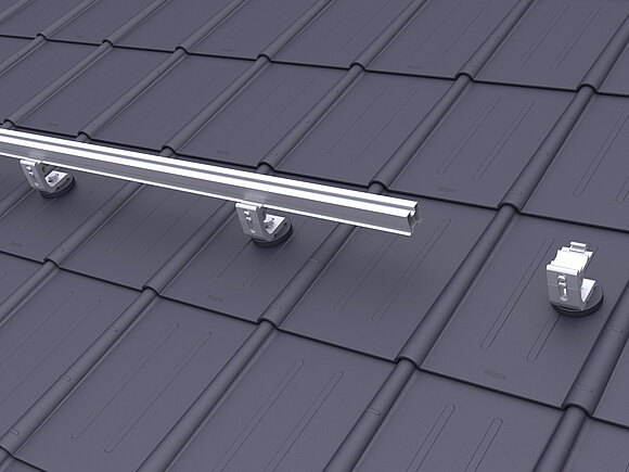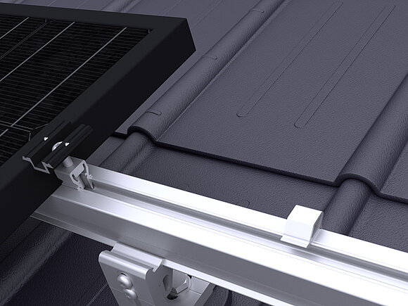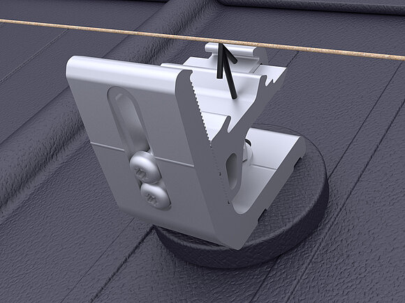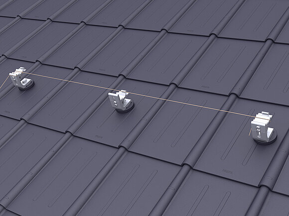 Daarbij worden in de onderste modulereeks van een generatorvlak per module twee valbeveiligingen voor zonnepanelen op de bovenste (aan de nokzijde liggende) modulerail geklemd.