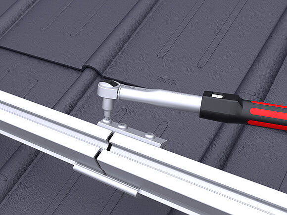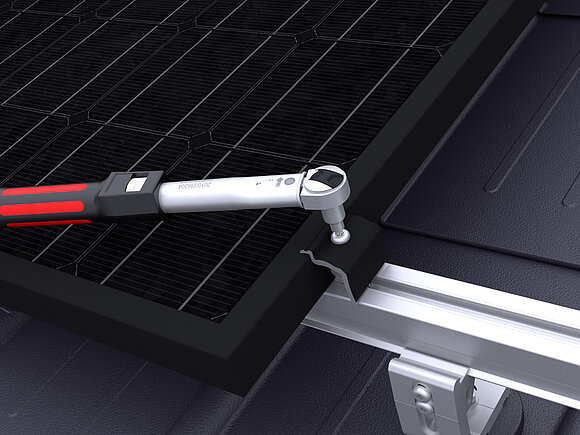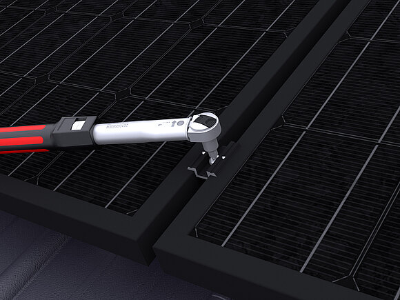 Aansluitend worden de modules geplaatst en worden de midden- respectievelijk eindklemmen vastgedraaid met een draaimoment van 15 Nm.