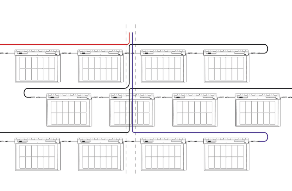 Een PREFA installatie met solar-dakpan vereist per string een in- en uitgaande leiding. Bovendien moeten de rijen dakpannen met elkaar verbonden worden met behulp van zogenaamde verbindingsleidingen.