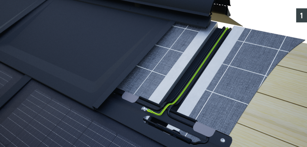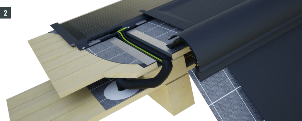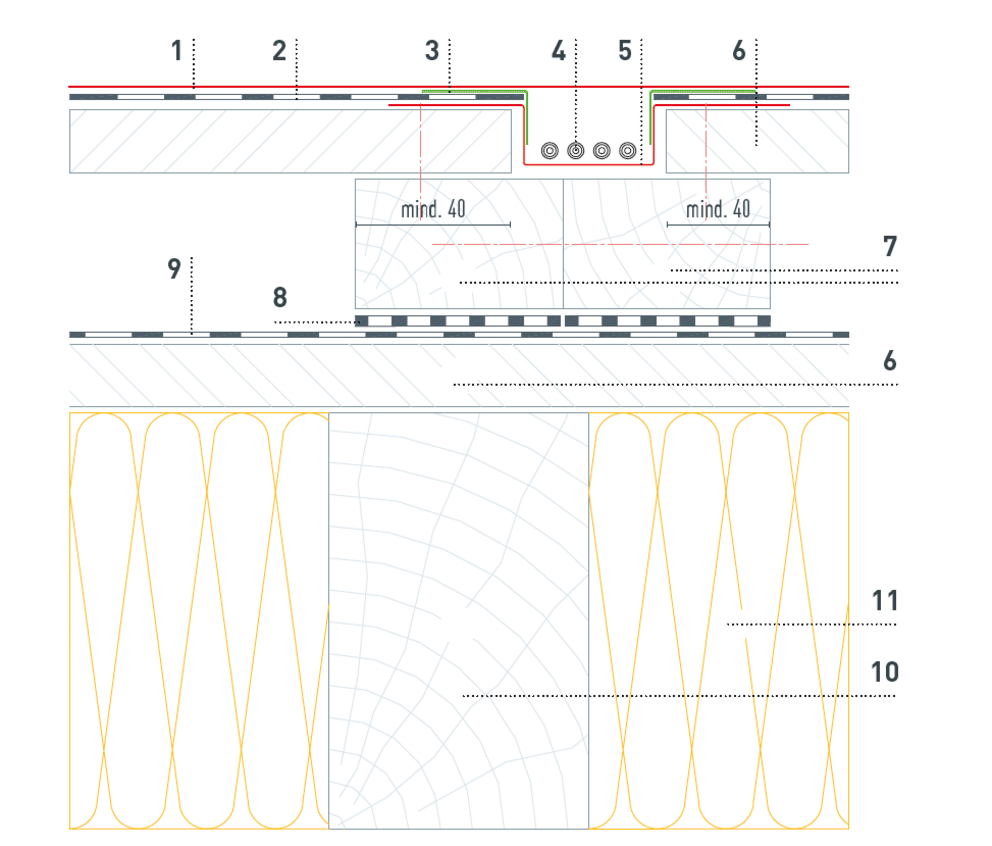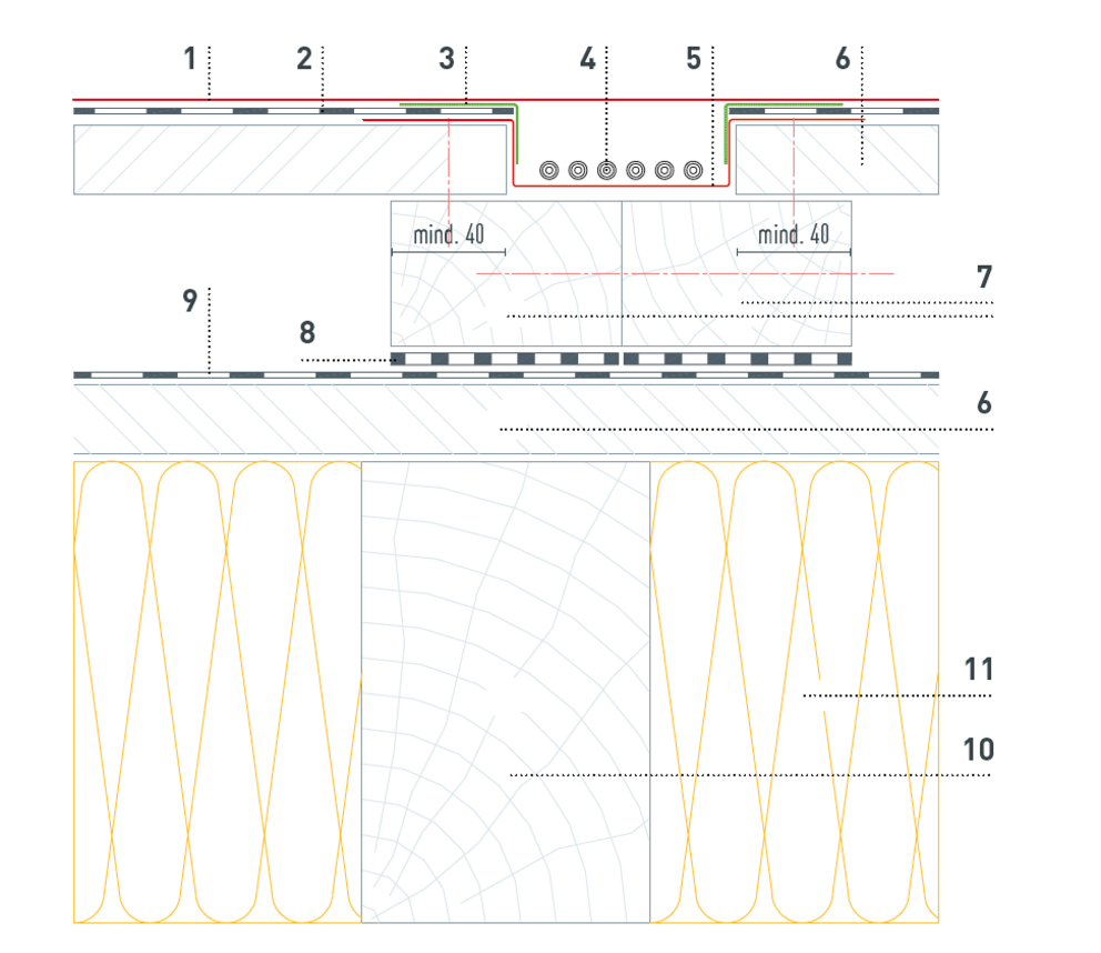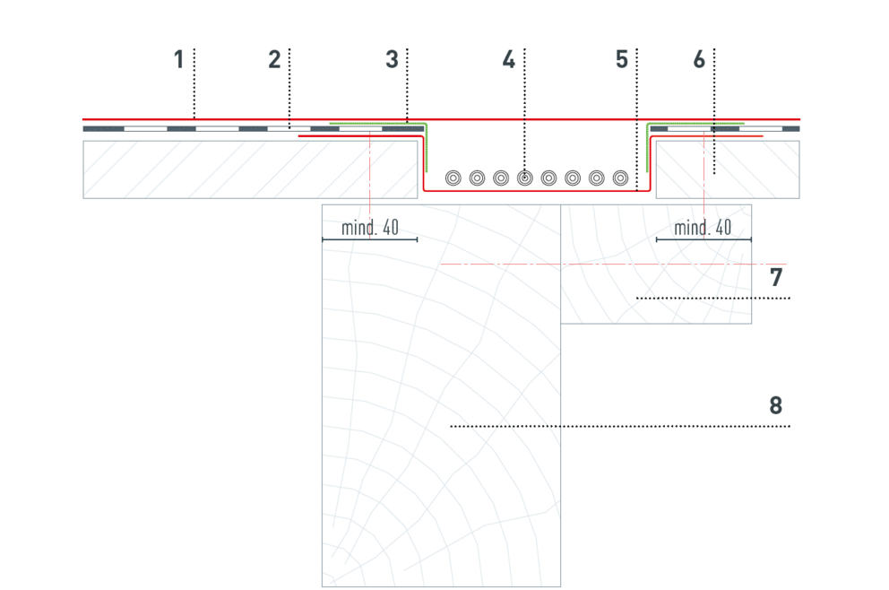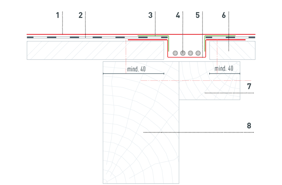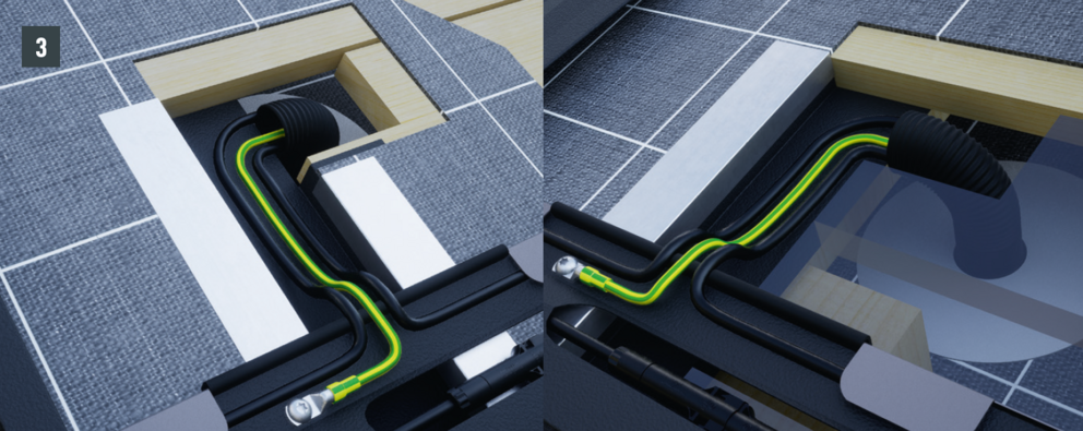 Omwille van de benodigde kabelgeleiding moet de houten onderconstructie in overeenstemming met de volgende details gerealiseerd worden. Het aantal en de positie van de kabelgoten worden bepaald door PREFA Producttechniek en weergegeven in het PV-plaatsingsplan.