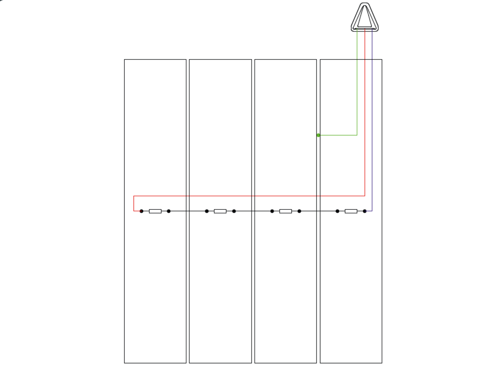 Een PREFALZ-installatie met solarmodules vereist per strengkabel een in- en uitgaande leiding. In de volgende schematische schets van de bekabeling worden ter verduidelijking de ingaande leiding in het blauw, de uitgaande leiding in het rood, de aardleiding in het groen en de moduleleidingen in het zwart weergegeven.